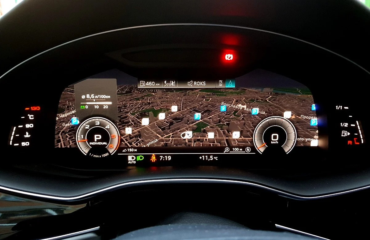 Я очень люблю возможность полной кастомизации панели приборов, с выводом туда навигации и массы полезной информации. Мне нравится отдельный экран для управления климат-контролем, эргономика очень продумана — с водительского места удобно регулировать температуру и подогревы по всему салону (привет, некоторым премиальным конкурентам, у которых для того, чтобы выключить что-то сзади после того, как пассажиры вышли, нужно остановиться и выйти из машины).