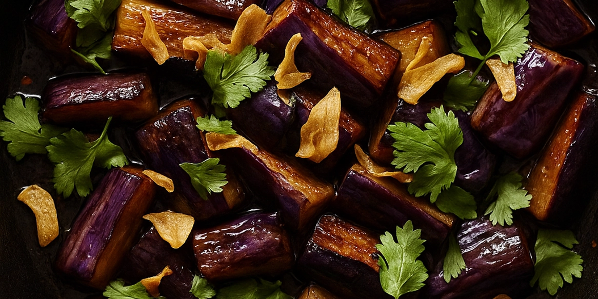 Ароматные баклажаны в кисло-сладком соусе с чесночными чипсами