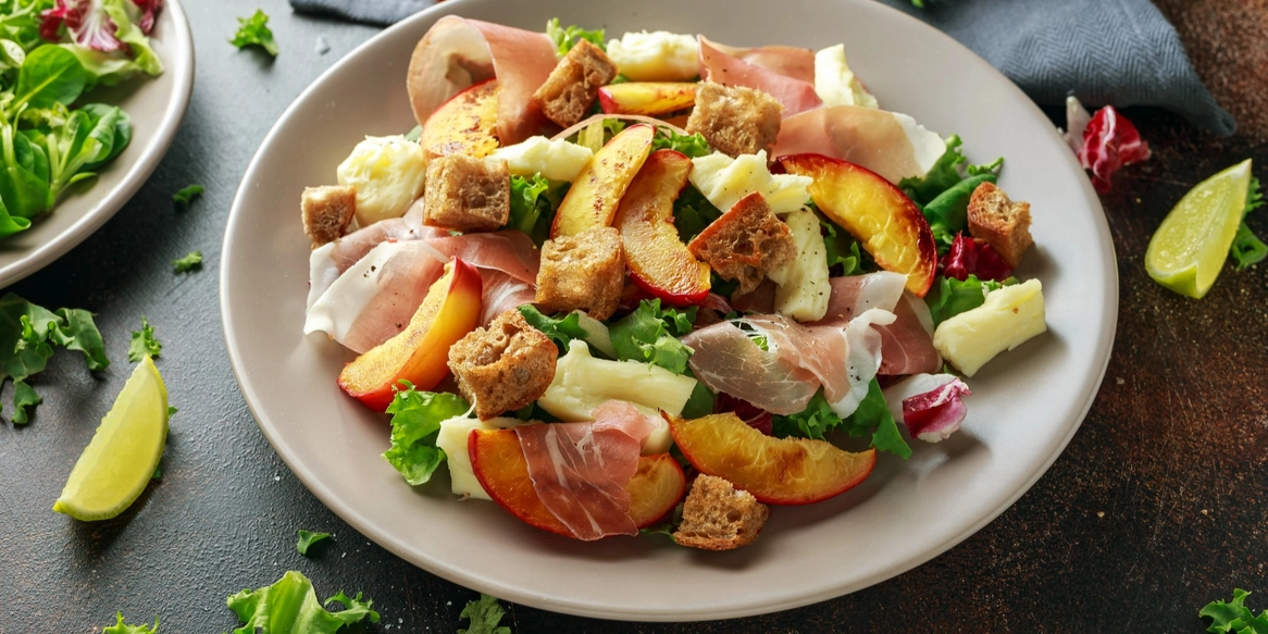 Салат из персиков и прошутто с фисташковым песто к праздничному столу