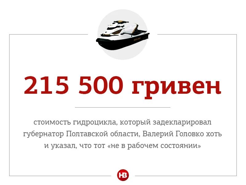 «Сосед» Райнина, губернатор Полтавской области Валерий Головко задекларировал 916 тыс. 952 грн. дохода, из них зарплата составляет более 89 тыс. грн. Более 629 тыс. грн. составляют дивиденды и проценты от Укргазбанка. Кроме того, у 50-летнего Головко указано более 56 тыс. грн. в графе «другие доходы», где ручкой уточнено, что это – пенсия. Помимо недвижимого имущества, у Головко – два автомобиля, прицеп и даже гидроцикл. Правда, в декларации он дописал уточнение – «не в рабочем состоянии». Приблизительная рыночная цена такого скутера – более 215 тыс. грн. У членов семьи (в декларации Головко указал жену Светлану) также есть автобус Setra S 250 1996 года выпуска. Купить такой можно от 25 до 35 тыс. долл. На счетах у Головко в Укргазбанке более 7 млн. 200 тыс. грн.