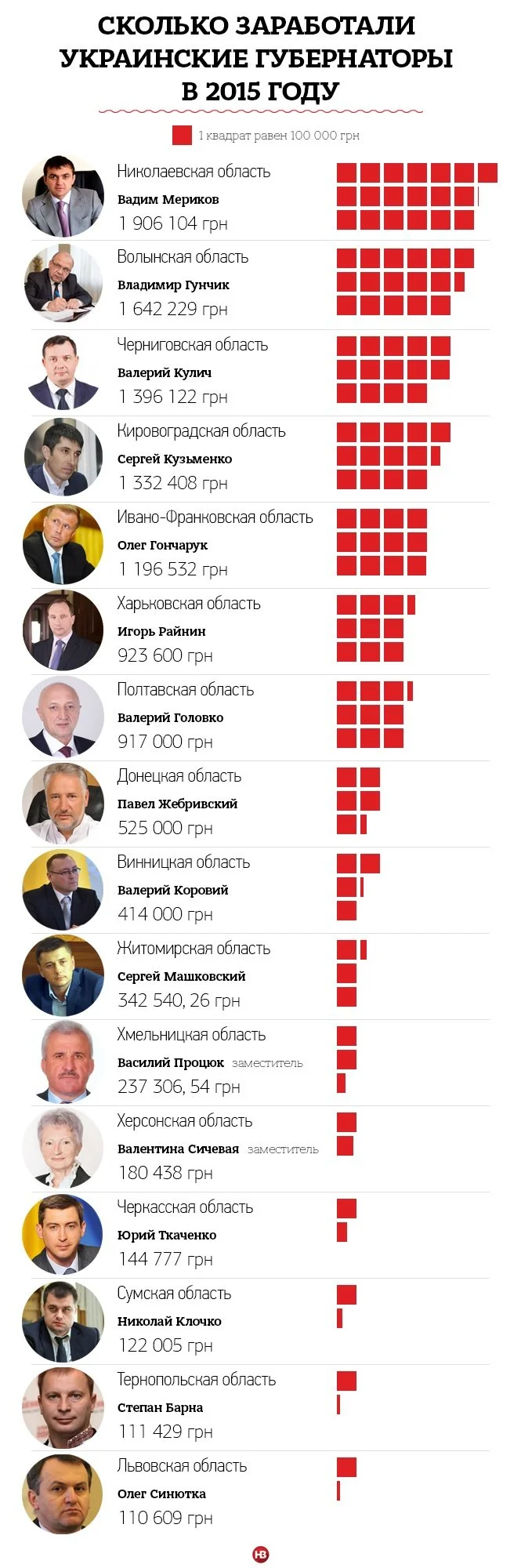 В остальных регионах Украины годовой доход губернаторов варьируется от 110 тыс. грн. – у главы Львовской области Олега Синютки, до 535 тыс. грн. у губернатора Донецкой области Павла Жебривского. У некоторых губернаторов есть «выигрыши» и материальная помощь.