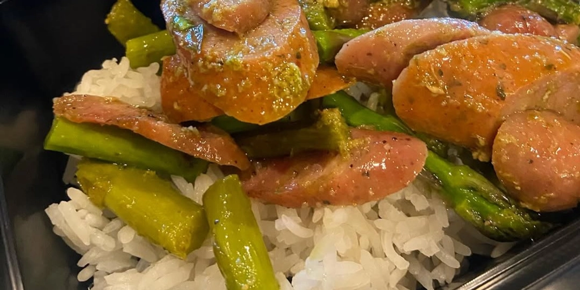 Рисові боули з цвітною капустою, спаржею на грилі та курячою ковбаскою