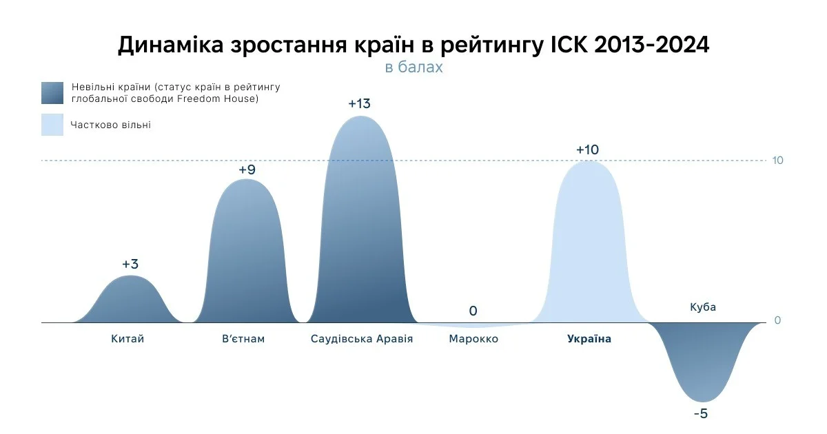 Погляньмо на показники групи країн з найвищою мірою відповідальності за корупцію в Індексі сприйняття корупції (ІСК) за 2024 рік. Частина з цих країн — Ірак, Іран, Таїланд, КНДР — має досить низькі бали і посідає в рейтингу нижчі позиції, ніж Україна.