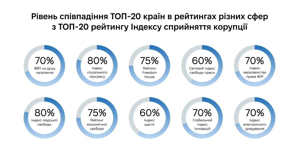 Для підтвердження тези можна порівняти першу двадцятку країн в Індексі сприйняття корупції та десяти інших світових індексах і рейтингах, що відображають показники від розміру ВВП на душу населення та економічної свободи до свободи преси та рівня задоволеності життям (індекс щастя). В середньому перелік держав-лідерів у ключових метриках співпадає на понад 70%.