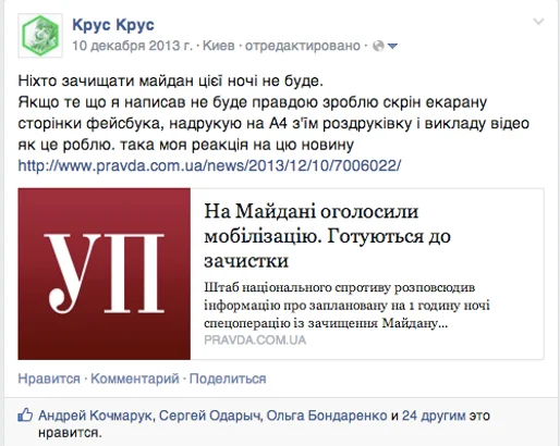 Він також розповідав, як роздрукував і з'їв свій пост у Facebook від 10 грудня 2013 року про те, що тієї ночі не будуть зачищати Майдан.