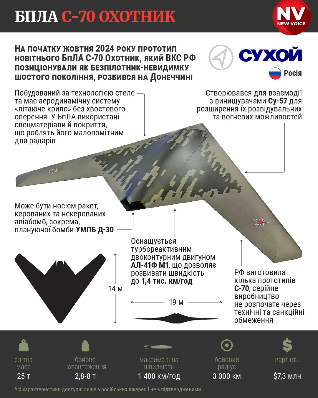 У небі над Костянтинівкою Донецької області збили не російський літак Су-25, а важкий ударний БПЛА С-70 Охотнік, повідомляє Оперативний ЗСУ у суботу, 5 жовтня.