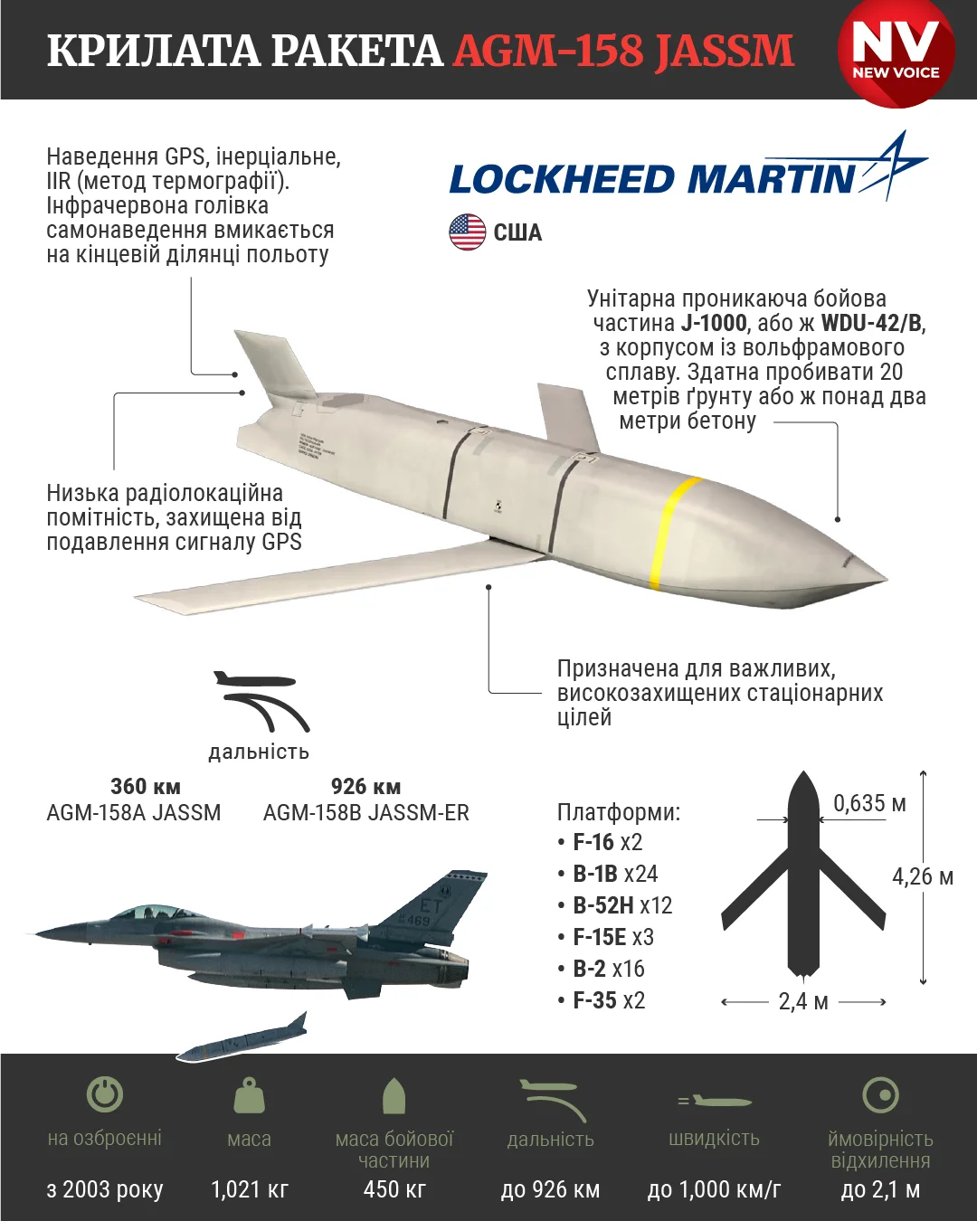 «Якщо ж F-16 візьмуть під крило високоточні ракети класу повітря-поверхня AGM-158 JASSM, — розмірковує колишній офіцер Повітряних сил, — то тут є додаткове питання: А з якою операційною дальністю нам їх нададуть — 500 км чи 950 км?»