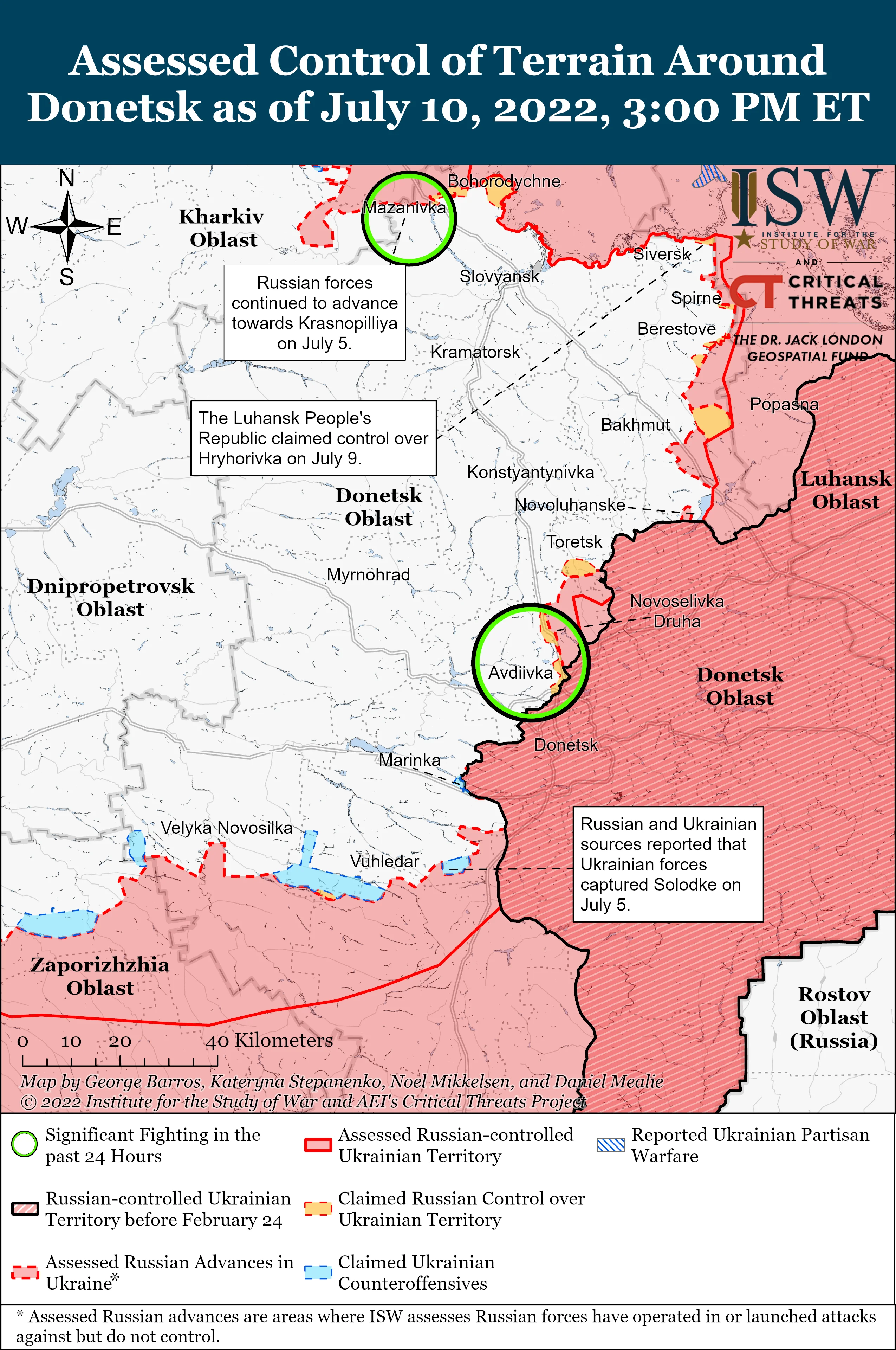 ISW нагадує, що 10 липня російські війська продовжували завдавати артилерійських ударів у районі Сіверська та обстріляли низку населених пунктів, але не робили спроб штурму в цьому районі. Український Генштаб повідомив, що російські сили концентрують війська в районі Білогорівки, ймовірно, щоб зміцнити контроль над кордоном Луганської області та підготуватися до просування на захід. Окупанти також, ймовірно, прагнуть ізолювати Бахмут із заходу та півдня — додатково до їхніх зусиль заблокувати українські лінії постачання вздовж бахмутської ділянки траси E40.