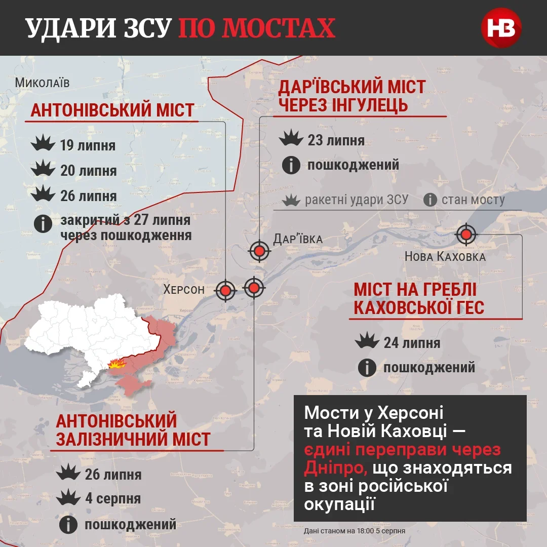 Українські сили в середу, 24 серпня, завдали нових ударів по мосту в районі Каховської ГЕС.