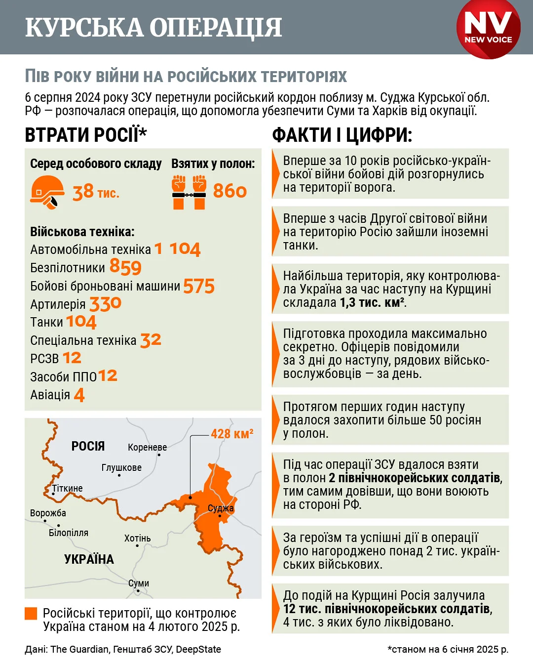 Українські військові розпочали Курську операцію 6 серпня 2024 року. Протягом пів року ЗСУ утримували місто Суджа, що розташоване біля кордону України з Росією, а також контролювали значні території Суджанського, Коренєвського та Глушковського районів.