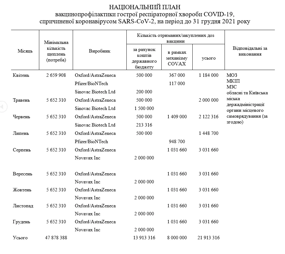 Водночас зазначено, що мінімальна потреба в кількості щеплень у 2021 році - 47,878 млн доз.