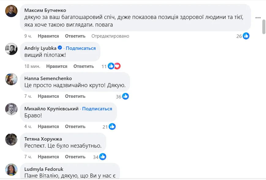 «Коли український спортсмен перемагає російського — українці аплодують. Коли український інтелектуал вступає в суперечку з російським — його засуджують. Віталій Портников чудово продемонстрував, що росіян можна і треба розмазувати не лише на спортивних майданчиках», — підтримав Портникова Володимир В’ятрович.