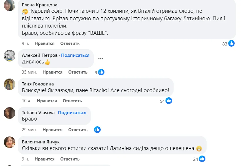 «Латиніна — це той мотоцикл з орками, що з розгону їхав на українські позиції. Червоний з намистом. Віталій Портников не розгубився — миттєво нейтралізував ху*ту, що насувалася, чергою впритул. Ось воно завалилось, димить. Імперський голос за кадром продовжує волати: „Вперед! Давай вперед!“ А всі мертві. І лише колесо підбитого мотоцикла продовжує крутитися за інерцією, створюючи ефіри, рілзи та сторіз…» — метафорично описав дискусію Портникова з Латиніною Сергій Кошман.