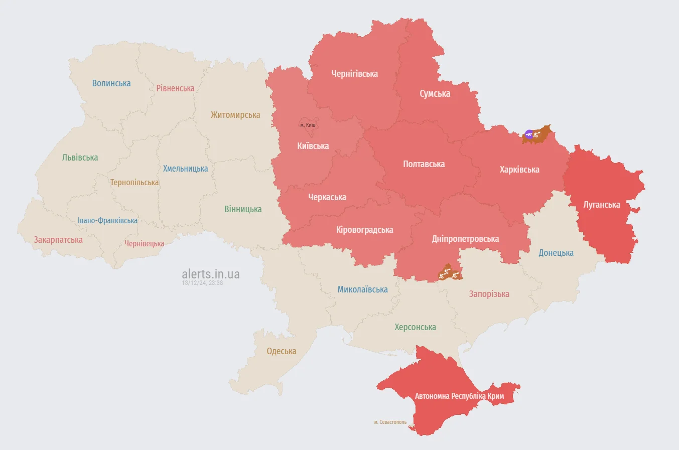 Вдень і ввечері 12 та вночі проти 13 грудня Росія атакувала Україну десятками ударних БПЛА, а вранці завдала масованого удару ракетами — як балістичними, так і крилатими, зокрема ракетами Калібр з моря і Х-101 з літаків Ту-95МС.