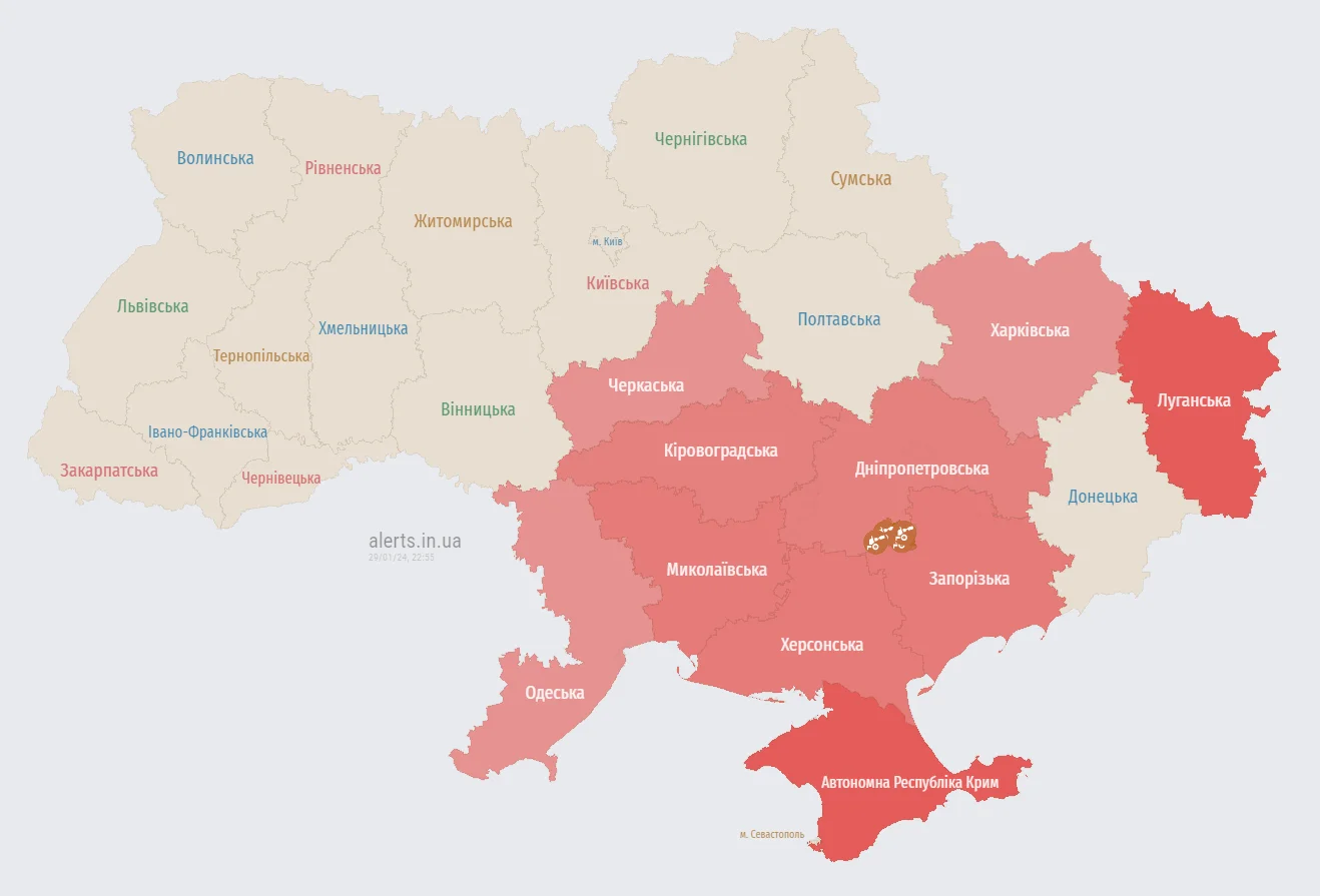 Тривогу оголошено у всіх східних та центральних областях, зокрема на Київщині.