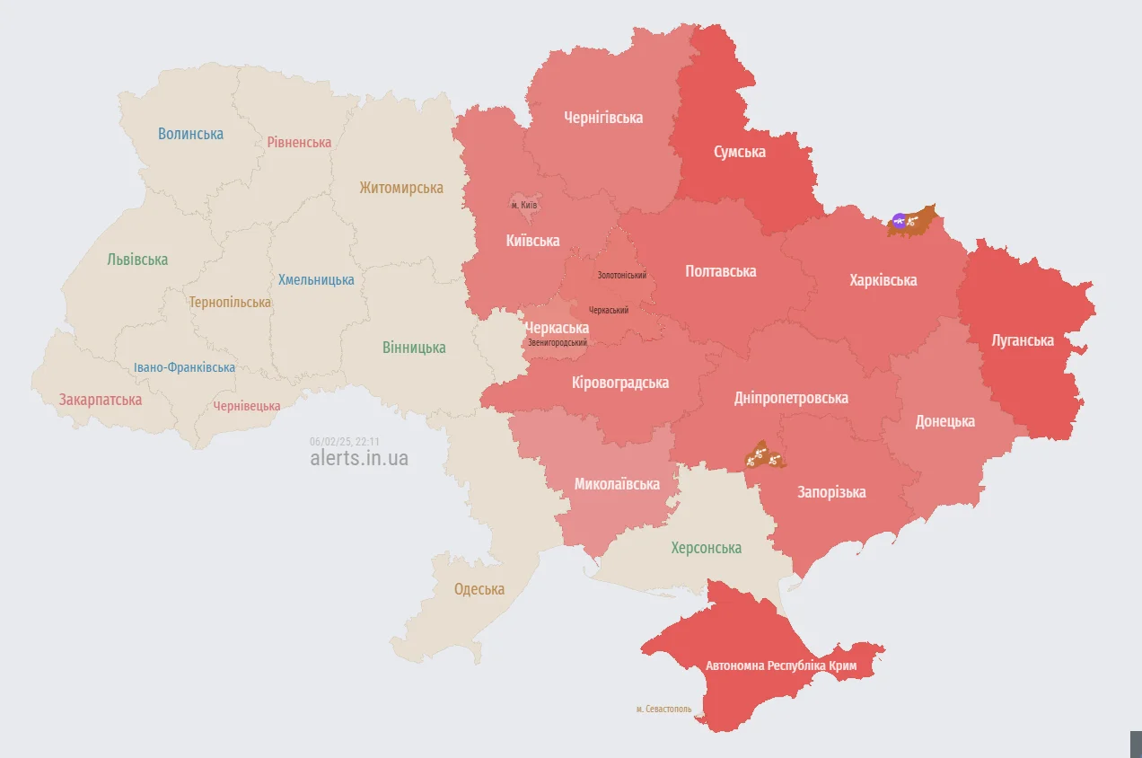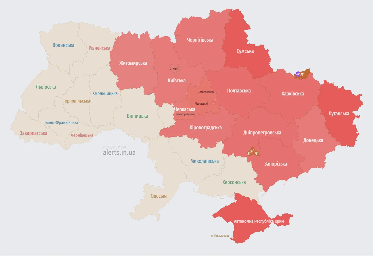 У ніч проти 6 лютого Росія атакувала Україну 77 ударними дронами Shahed і безпілотниками-імітаторами різних типів, а також двома балістичними ракетами Іскандер-М. ППО збила 56 дронів в 11 областях — Харківській, Полтавській, Сумській, Київській, Черкаській, Чернігівській, Житомирській, Вінницькій, Запорізькій, Дніпропетровській та Одеській. Ще 18 російських дронів-імітаторів були локально втрачені.