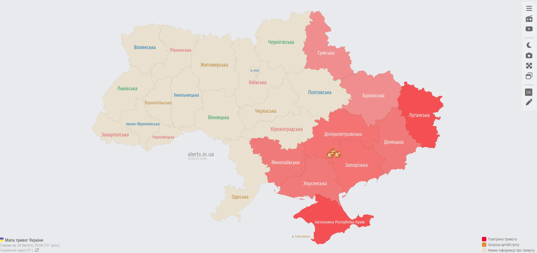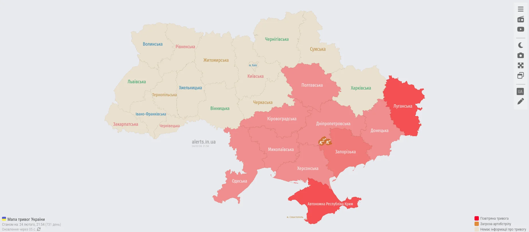 Станом на 21:54 повітряну тривогу оголошено в Херсонській, Одеській, Миколаївській, Запорізькій, Кіровоградській, Дніпропетровській, Донецькій та Полтавській областях.