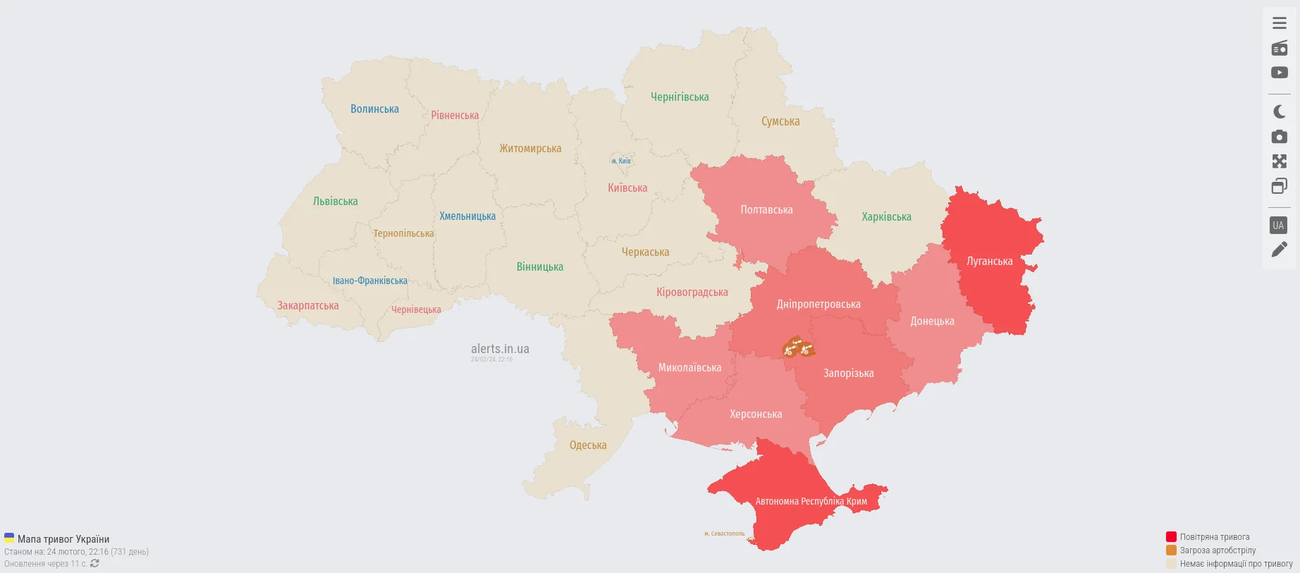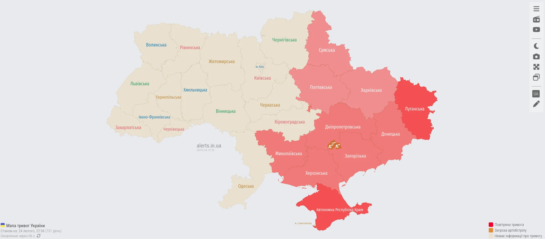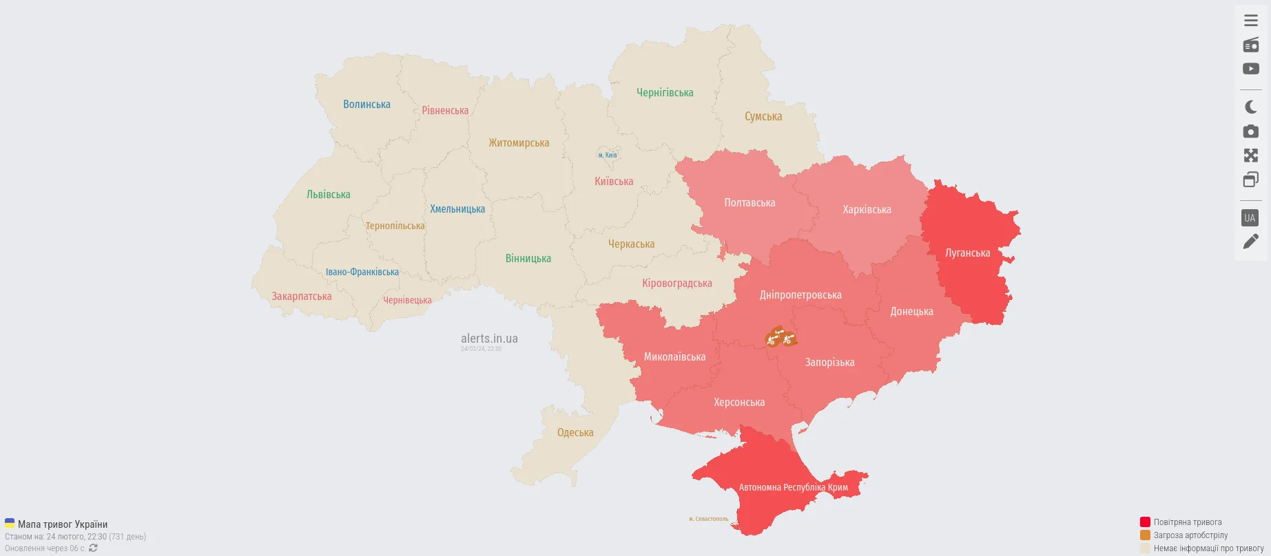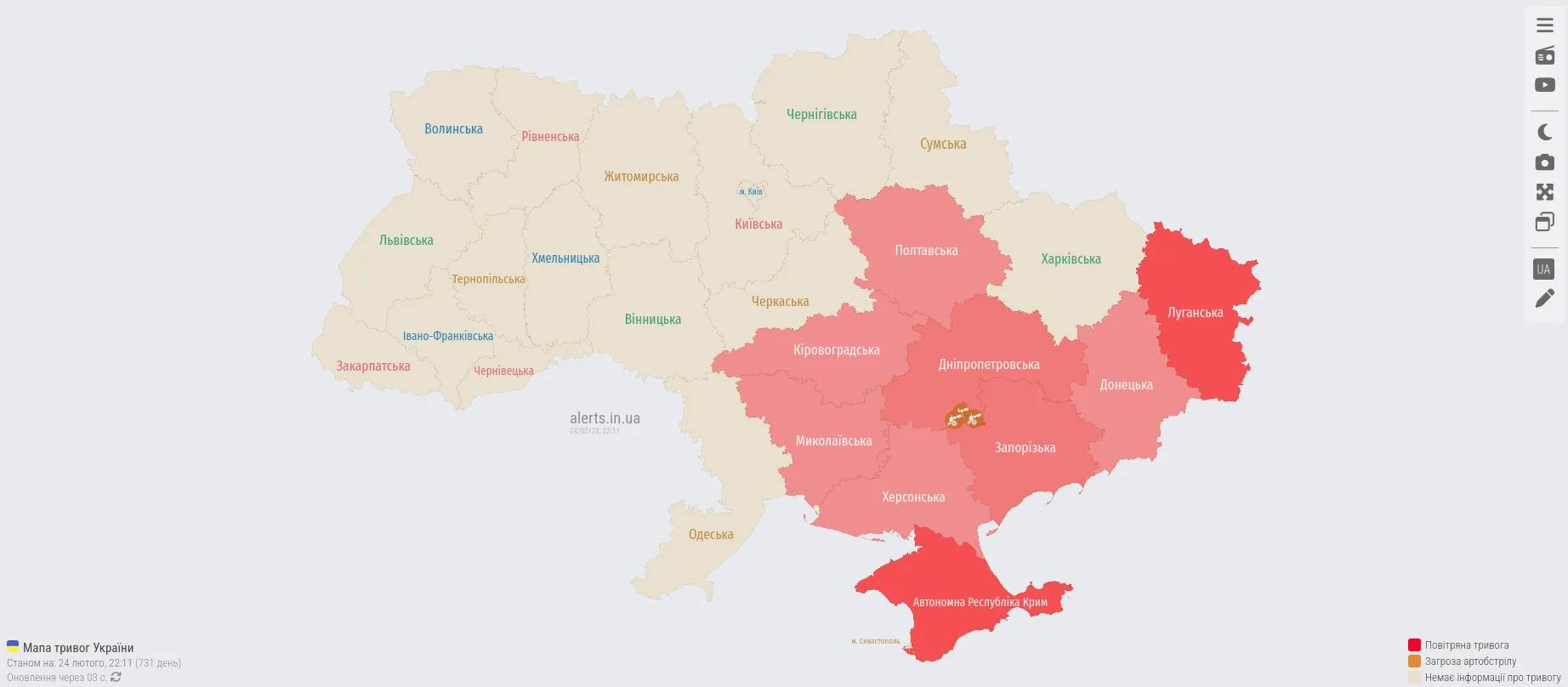 Ввечері 24 лютого та у ніч проти 25 лютого Росія атакувала Україну з півдня шахедами. У Київській області працювала протиповітряна оборона. На Хмельниччині пролунали вибухи.