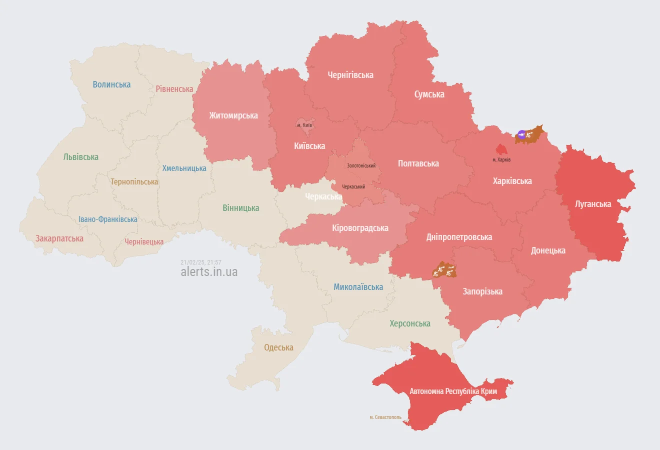У Києві та низці східних, північних і центральних областей України ввечері в п’ятницю, 21 лютого, оголосили повітряну тривогу через загрозу російських дронів-камікадзе.