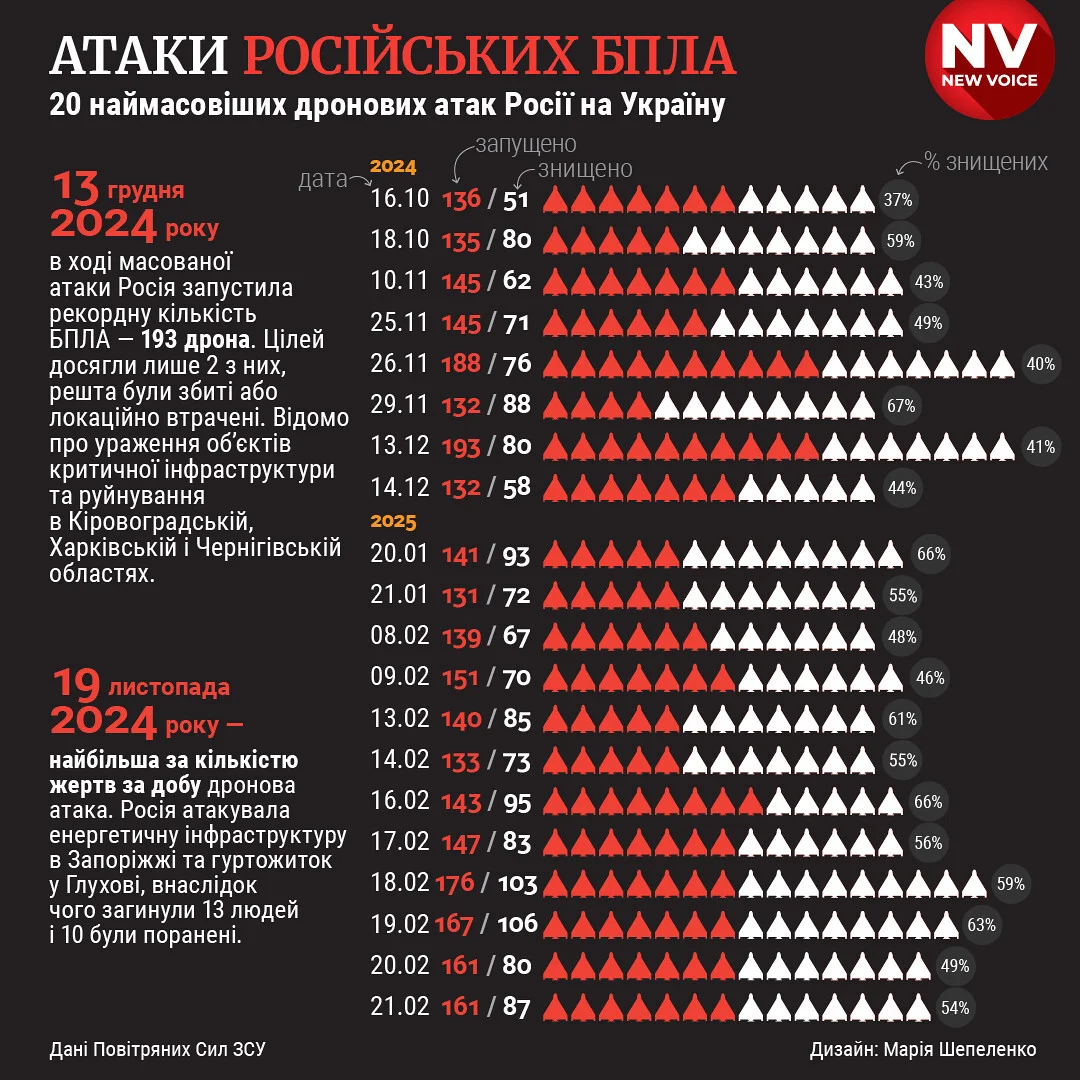 У ніч проти п’ятниці, 21 лютого, російська армія атакувала Україну 160 ударними БПЛА типу Shahed-131/136 та безпілотниками-імітаторами різних типів, сили ППО знищили 87 шахедів. За даними Повітряних сил, ще 70 ворожих безпілотників-імітаторів було локально втрачено (без негативних наслідків). Внаслідок ворожої атаки постраждали Одеська, Київська, Полтавська та Харківська області.