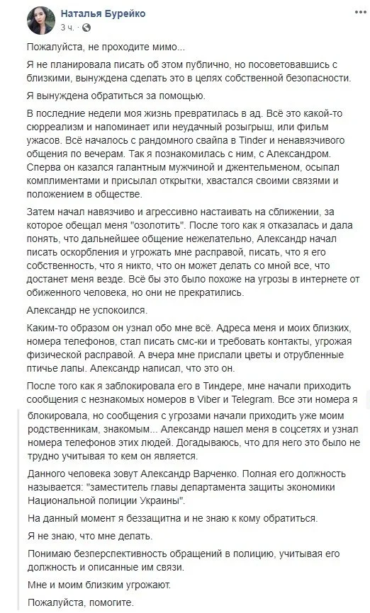Увечері 7 листопада дівчина опублікувала на своїй сторінці в Facebook великий пост, у якому розповіла про домагання та погрози з боку Олександра Варченка.