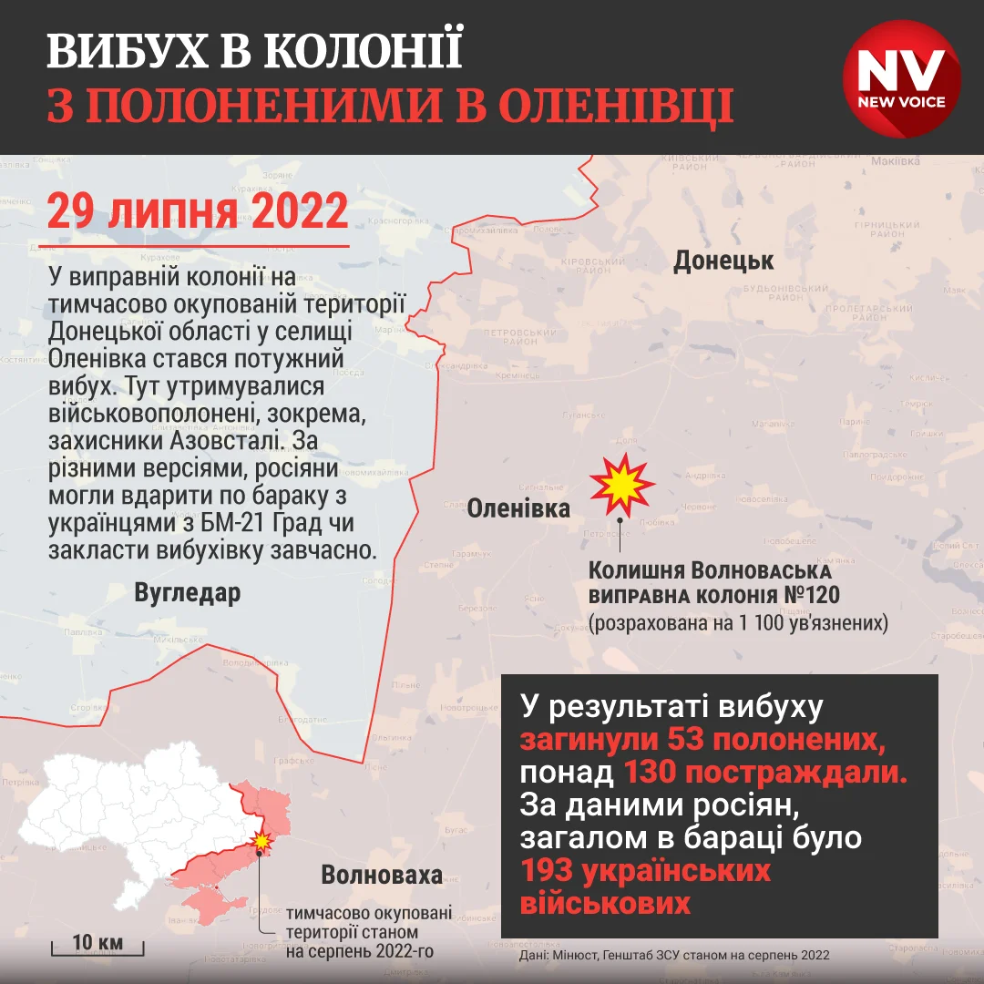 У колонії окупанти утримували 193 полонених, зокрема, захисників Маріуполя, серед яких — бійці Азова. Відомо про щонайменше 50 загиблих і понад 70 поранених.