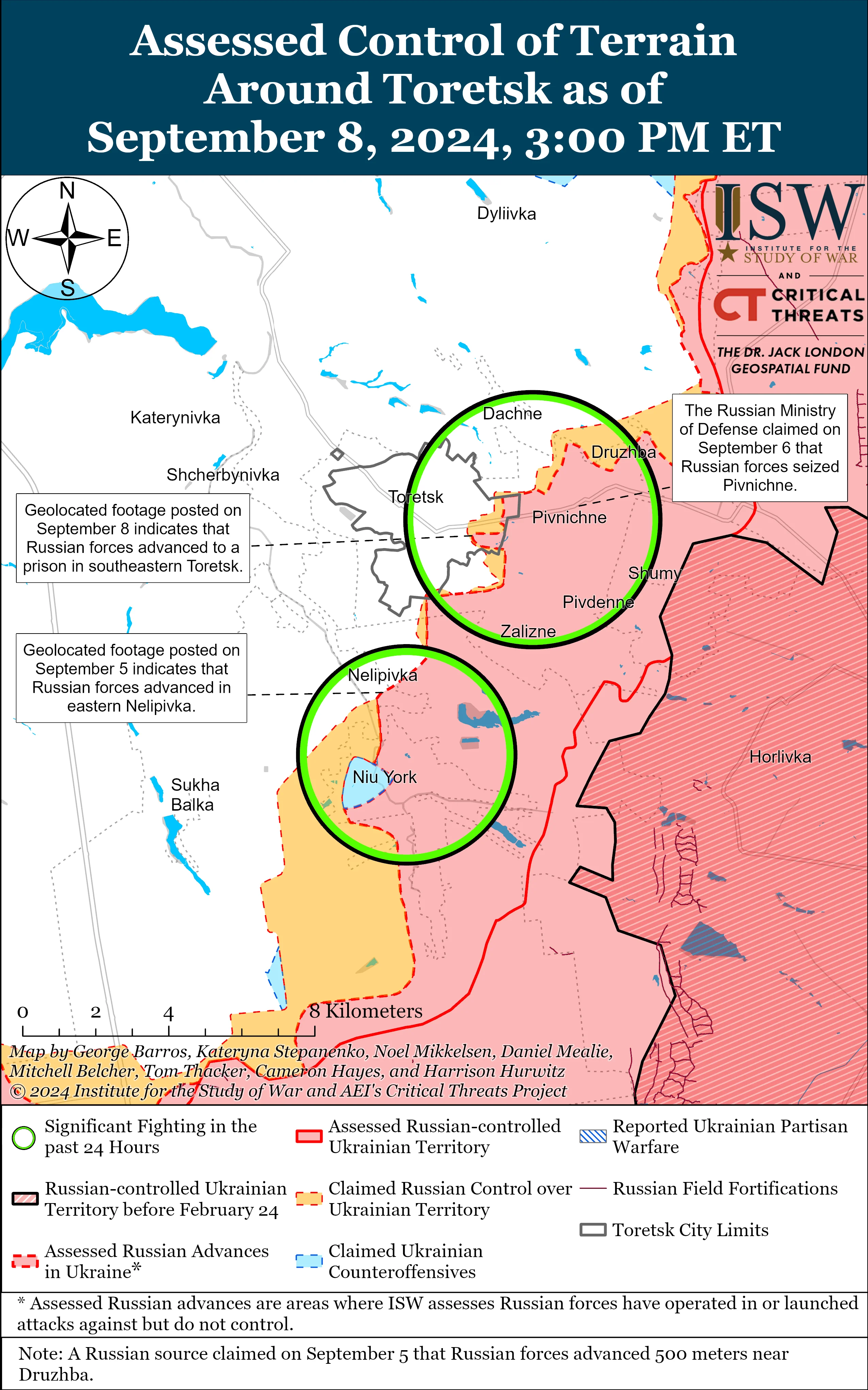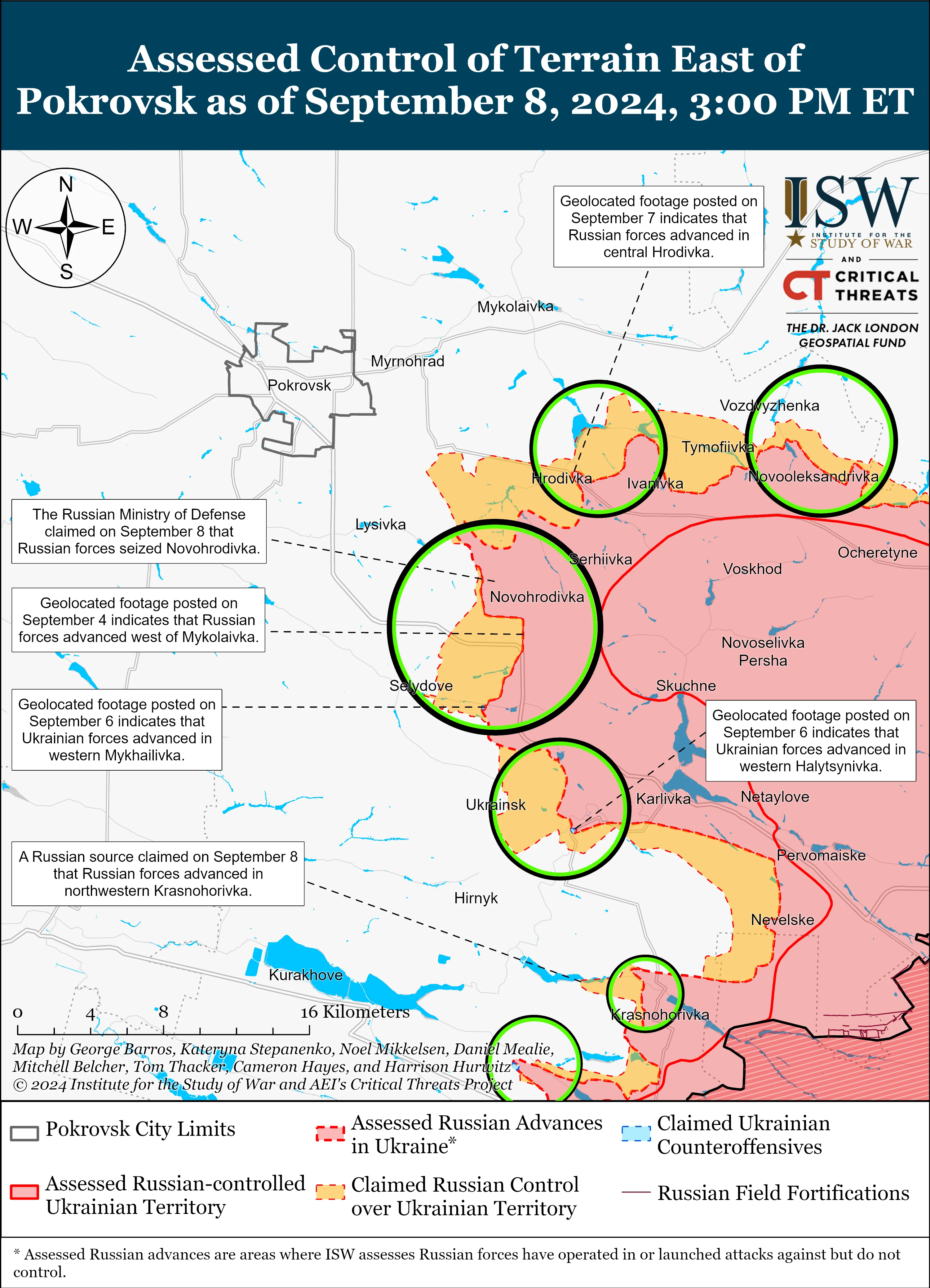 Водночас на Покровському напрямку російські війська за підсумками 8 вересня не досягли жодних підтверджених просувань. Один з російських «воєнкорів» стверджував, що окупанти нібито просунулися ближче до Гірника (на південний схід від Покровська), однак ISW не спостерігав візуальних доказів цієї заяви. Міністерство оборони Росії заявило, що війська РФ захопили Новогродівку (місто на південний схід від Покровська), однак ISW нагадує, що це ймовірно сталося ще принаймні 2 вересня.
