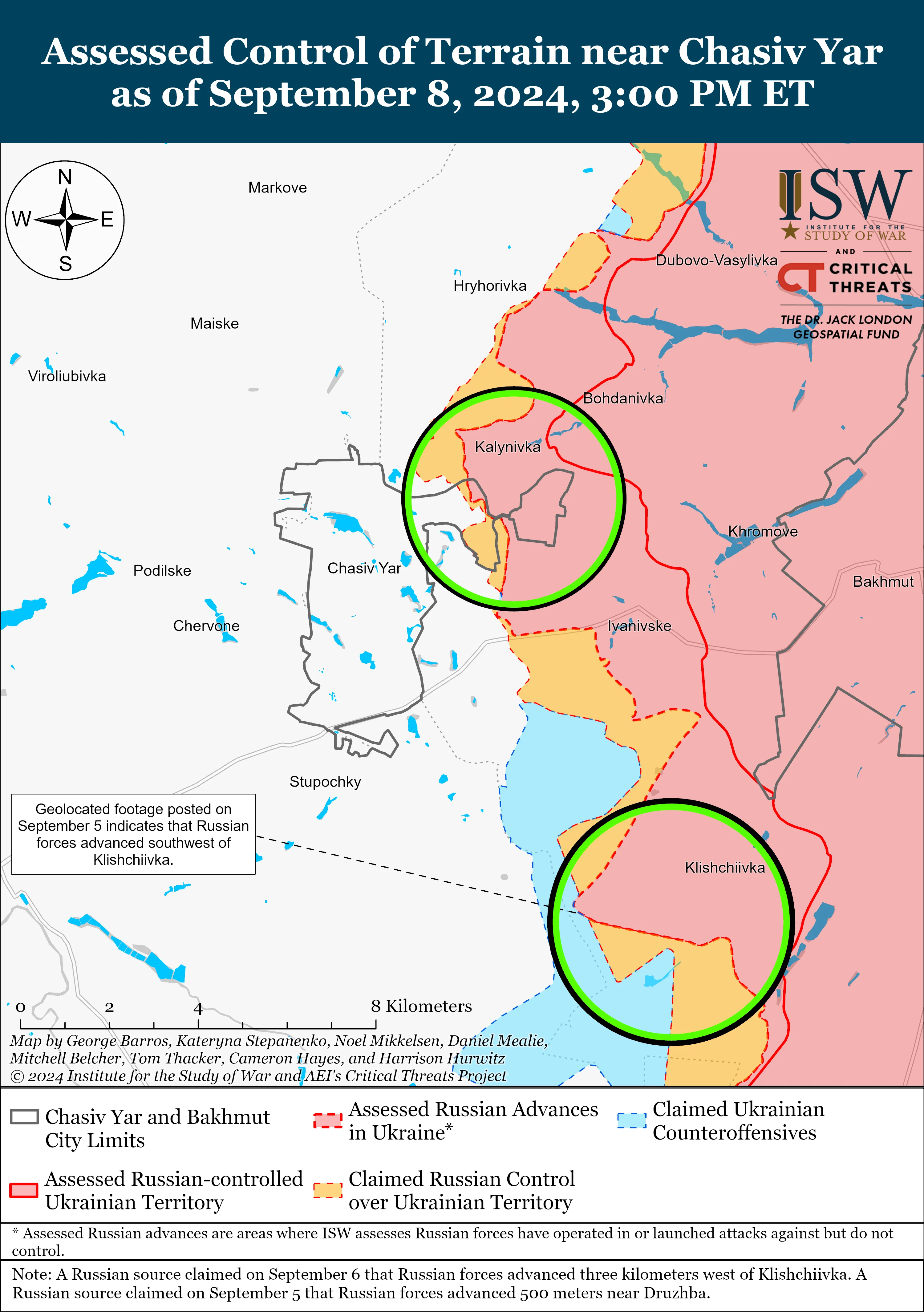 Тим часом росіяни нещодавно просунулися в районі на північ від Часового Яру. Кадри з підтвердженою геолокацією, опубліковані 8 вересня, свідчать, що війська РФ нещодавно досягли незначних просувань у полях на північ від Калинівки (північніше Часовго Яру).