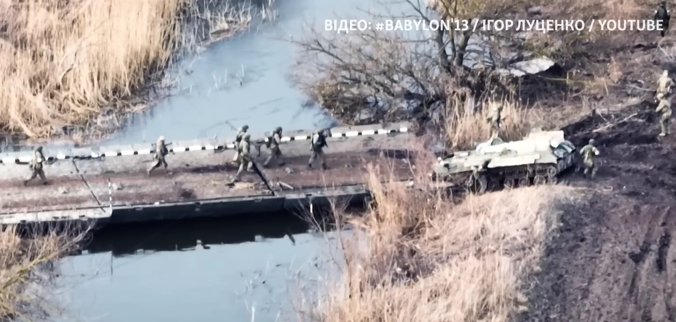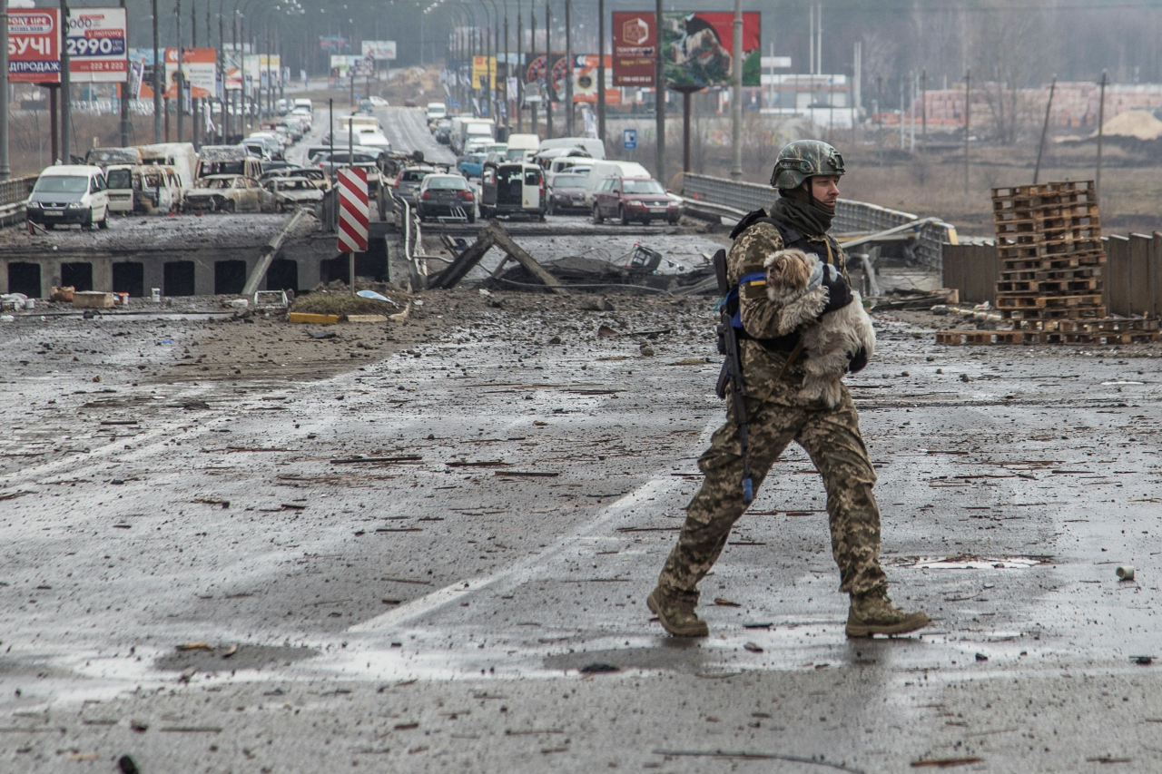 Український військовий біля зруйнованого Романівського мосту на виїзді з Ірпеня, березень 2022
