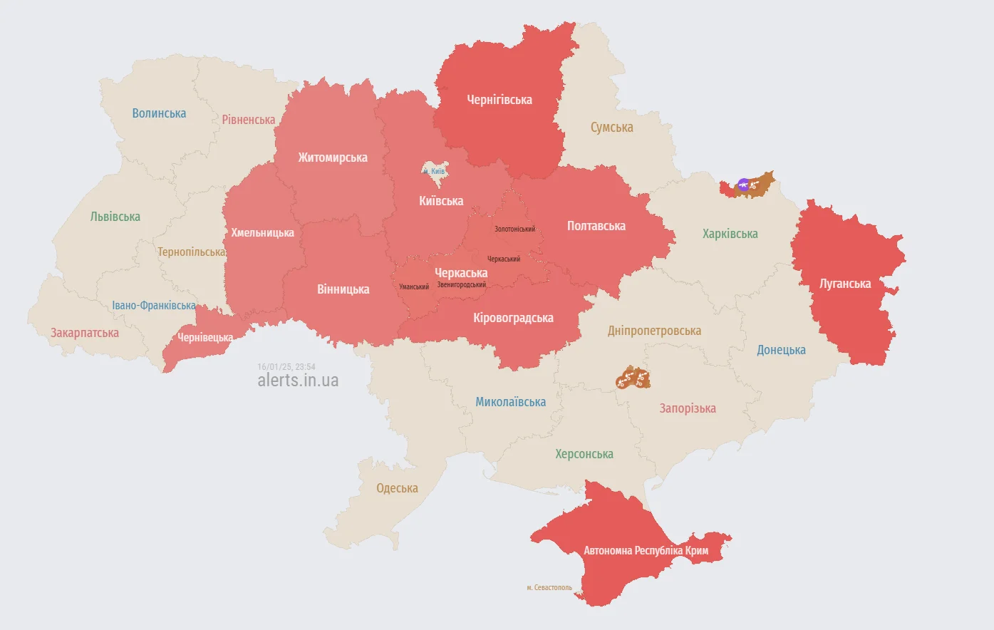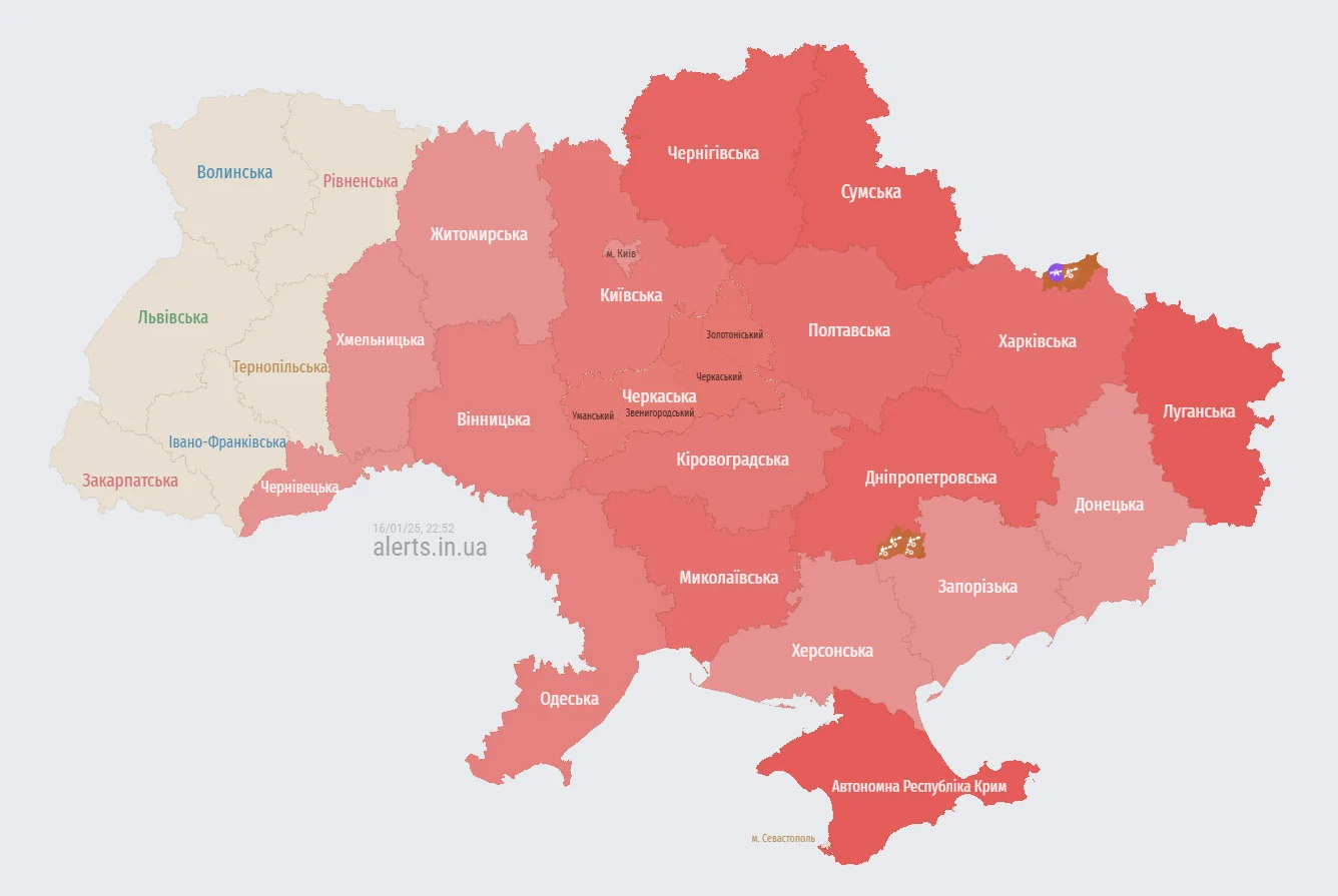 Увечері у четвер, 16 січня, у Києві та більшості областей України, крім західних, оголошено повітряну тривогу.