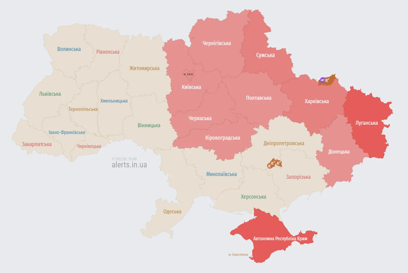 Уночі 17 лютого через російську атаку безпілотниками в багатьох областях оголошували повітряну тривогу. Повідомлялось про пошкодження в Запоріжжі, Харкові та Сумах, а також у чотирьох районах Київської області.