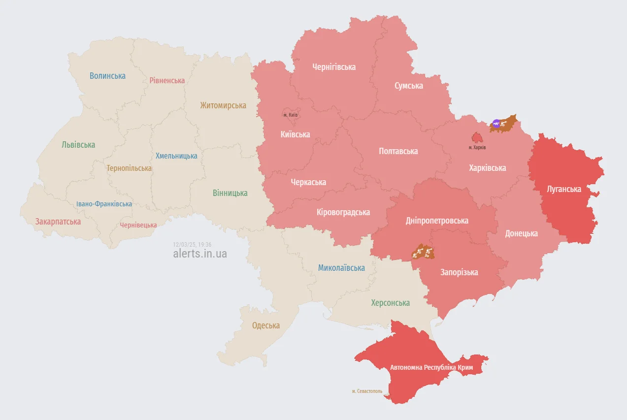 У Києві та низці областей України ввечері в середу, 12 березня, оголосили повітряну тривогу через загрозу балістики. Про це попередили Повітряні сили ЗСУ.