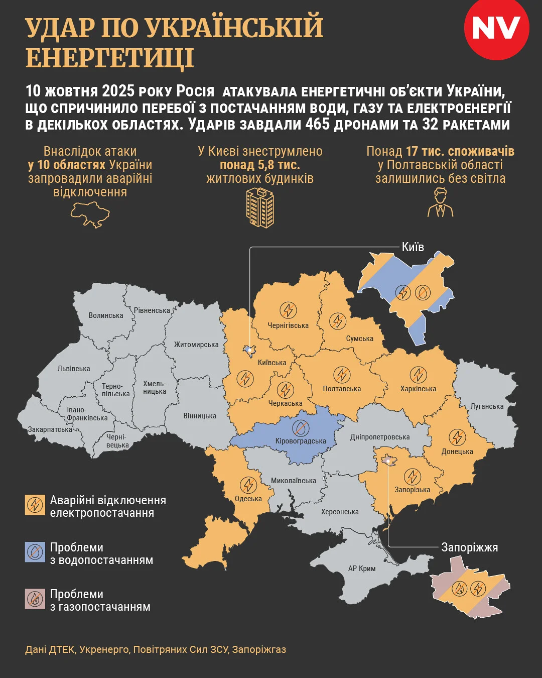 У ніч проти 10 жовтня РФ завдала масованого удару по енергосистемі України 497 засобами повітряного нападу, зокрема 465 дронами й 32 ракетами. ППО знешкодила 420 цілей.