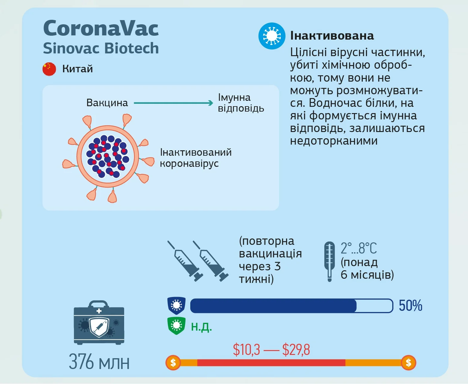 Вакцина від Sinovac Biotech (випускається під назвою CoronaVac) — це інактивована вакцина, тобто вона належить до найбільш традиційного виду вакцин.