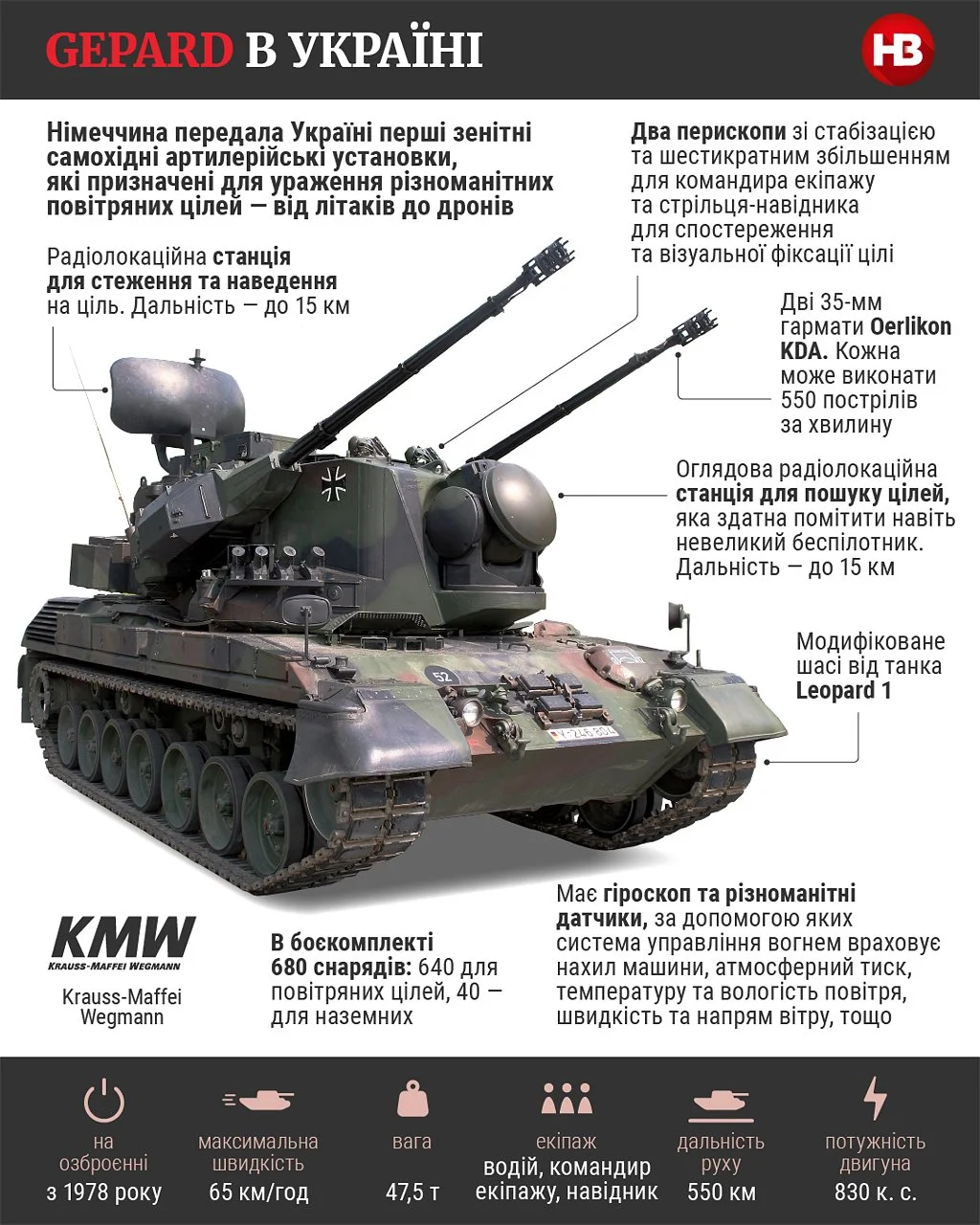 Вони призначені для ураження різноманітних повітряних цілей — від літаків до дронів. Німецька САУ обладнана двома 35-мм гарматами Oerlikon KDA, кожна може зробити до 550 пострілів за хвилину. У боєкомплекті Gepard 680 снарядів: 640 для повітряних цілей, 40 — для наземних.