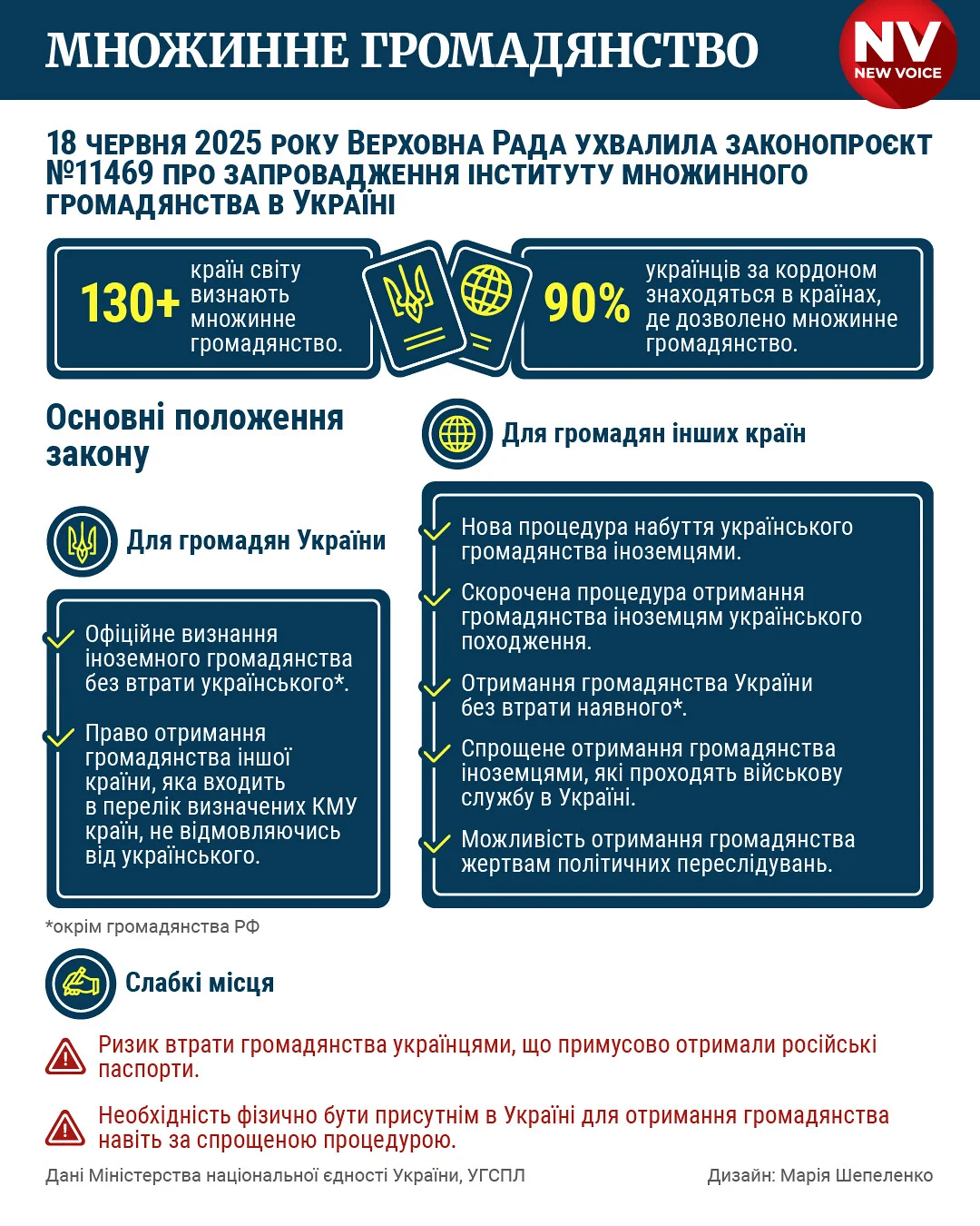 Множинне громадянство визнають понад 130 країн світу, а 90% українців за кордоном знаходяться в країнах, де дозволено множинне громадянство (за даними Мін'єдності).