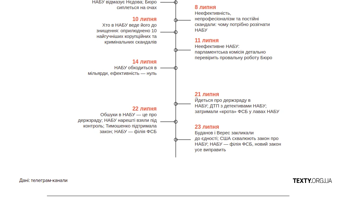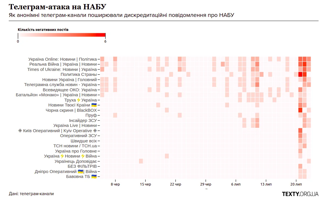 Також Texty.org.ua згадують, що 10 липня в Telegram-каналах з’явився рейтинг скандалів, пов’язаних із НАБУ: вони поширювали статтю Дошка ганьби. Хто і як веде НАБУ до закриття, опубліковану в Українських новинах.