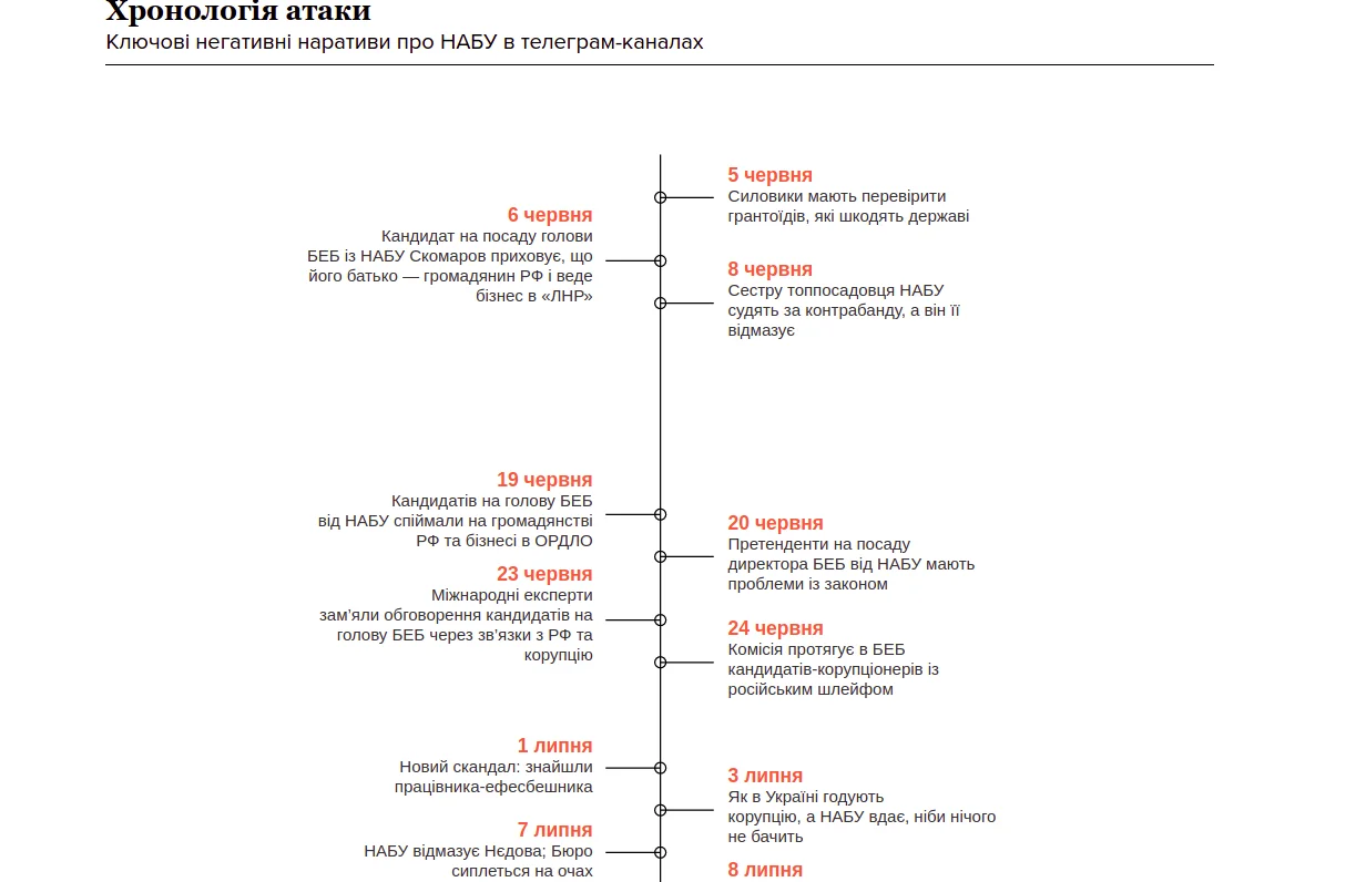У статті також наводиться схема з ключовими негативними наративами про НАБУ з повідомлень Telegram-каналів — від закликів до правоохоронців «перевірити грантоїдів, які шкодять державі» до повідомлень 23 липня про заклики до єдності голови ГУР Кирила Буданова та командира полку безпілотних систем К2 полковника Кирила Вереса, нібито підтримку законопроєкту № 12414 США, а також про те, що НАБУ — нібито філія ФСБ, а новий закон все виправить.