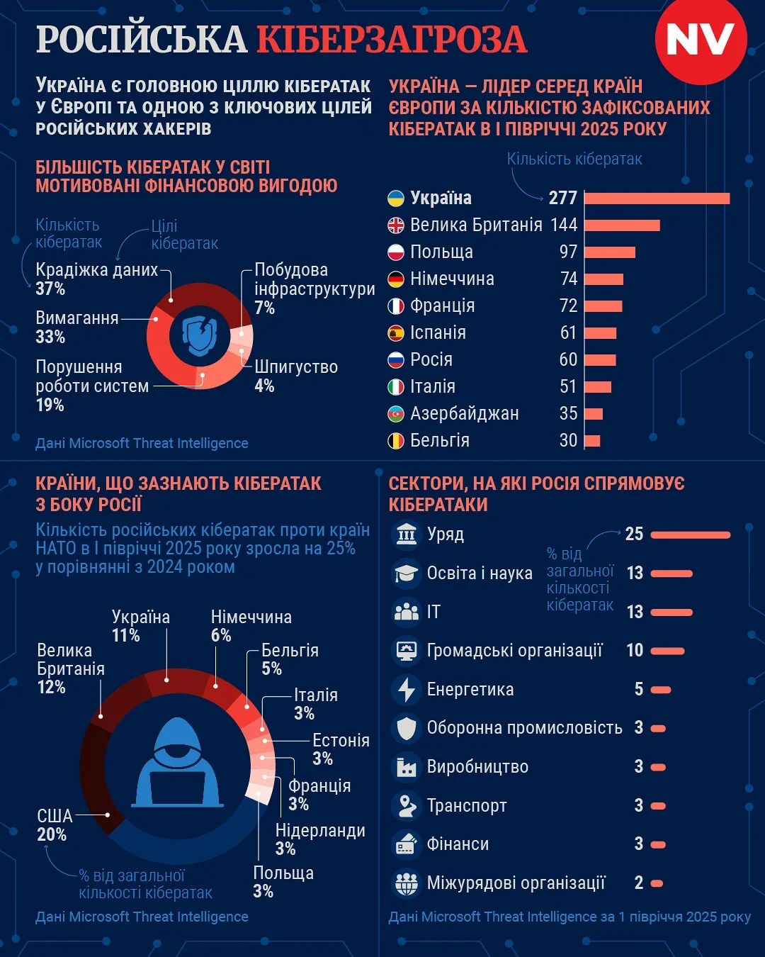 За даними дослідження Microsoft Threat Intelligence, Україна є головною мішенню кібератак в Європі та однією з ключових цілей російських хакерів. За 1 півріччя 2025 року вона зазнала 277 кібератак.