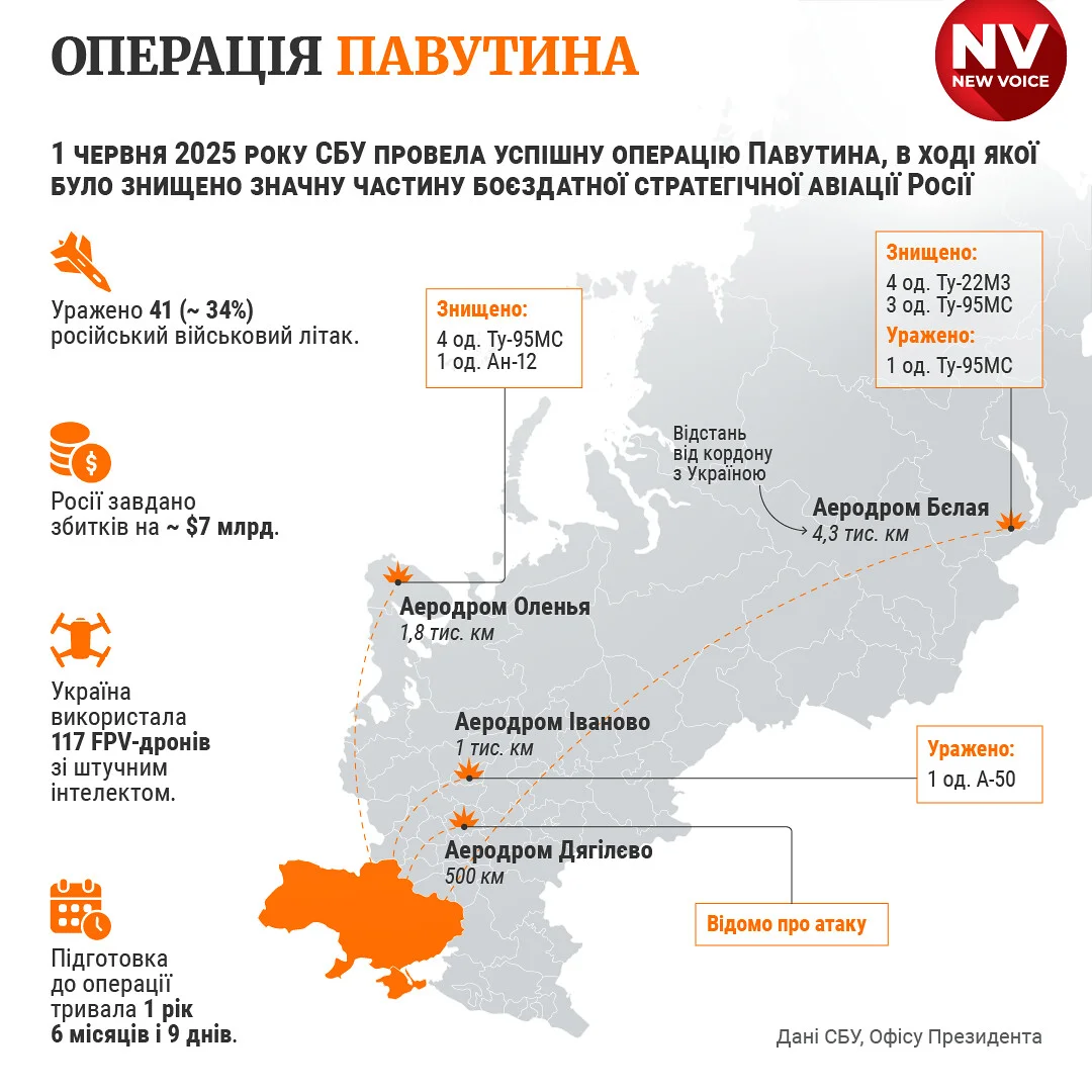 Супутникові знімки також зафіксували рештки бомбардувальників, які досі знаходяться на авіабазі Бєлая в Іркутській області та на авіабазі Оленья в Мурманській області — двох аеродромах, по яких українські війська завдали ударів під час операції Павутина 1 червня.