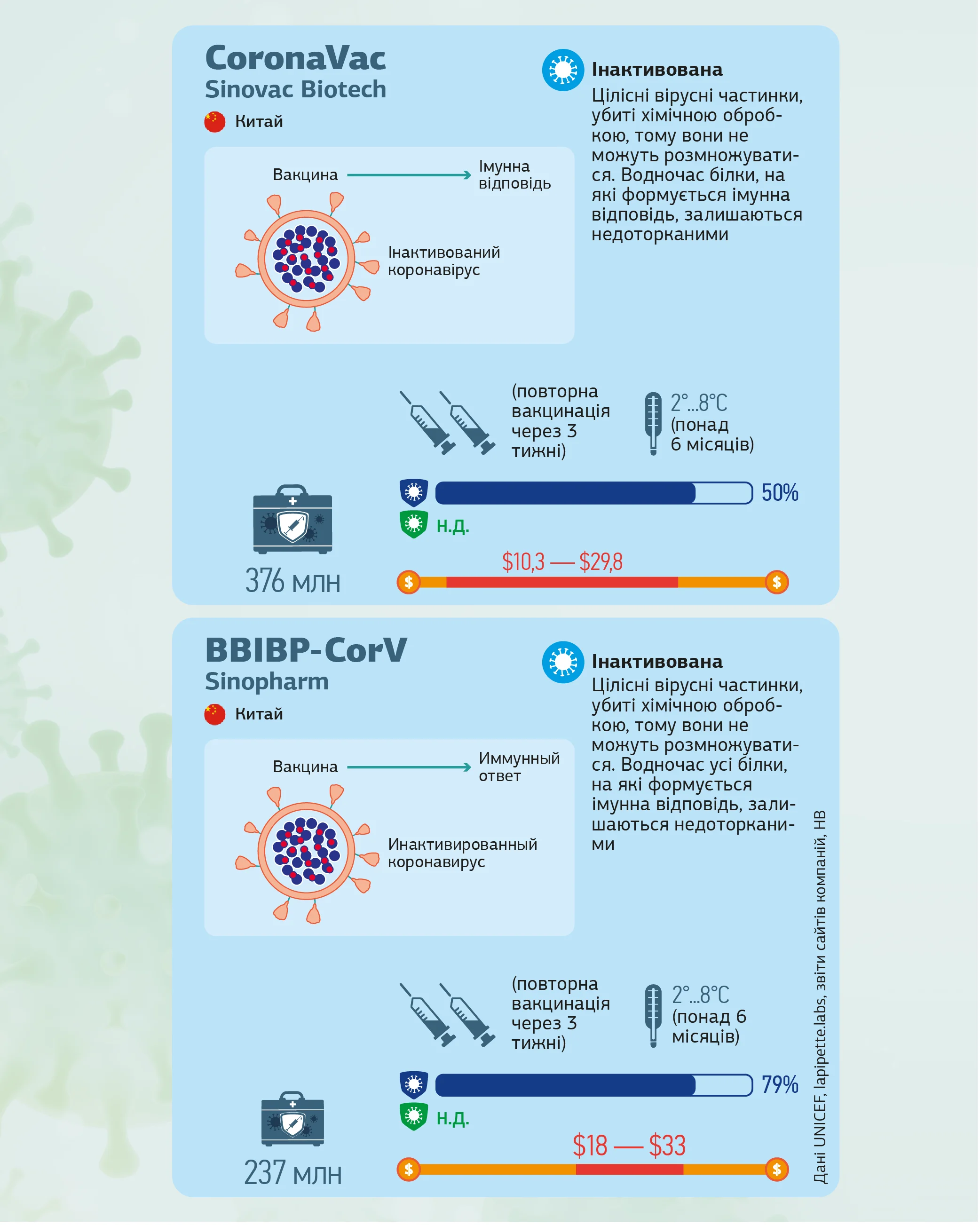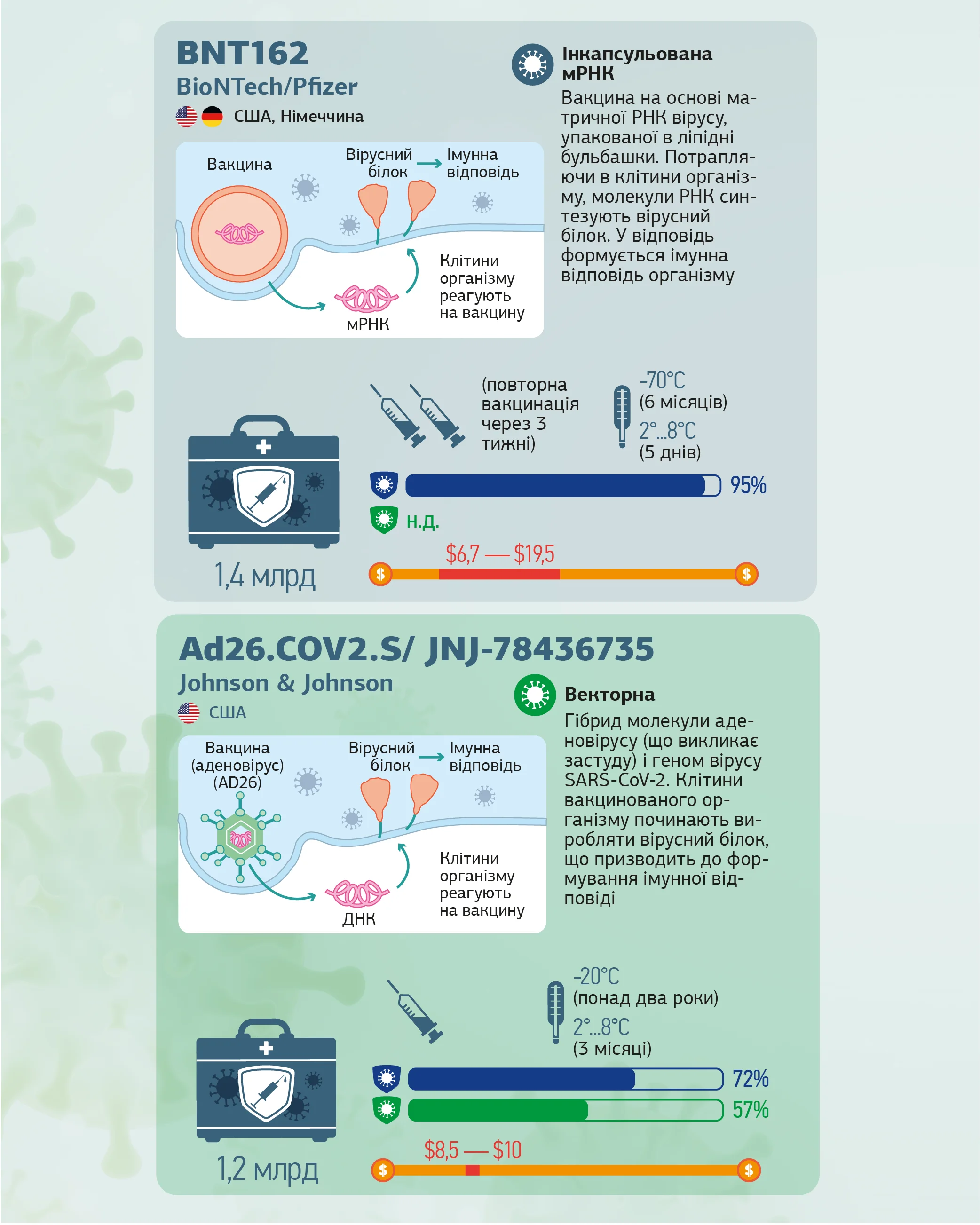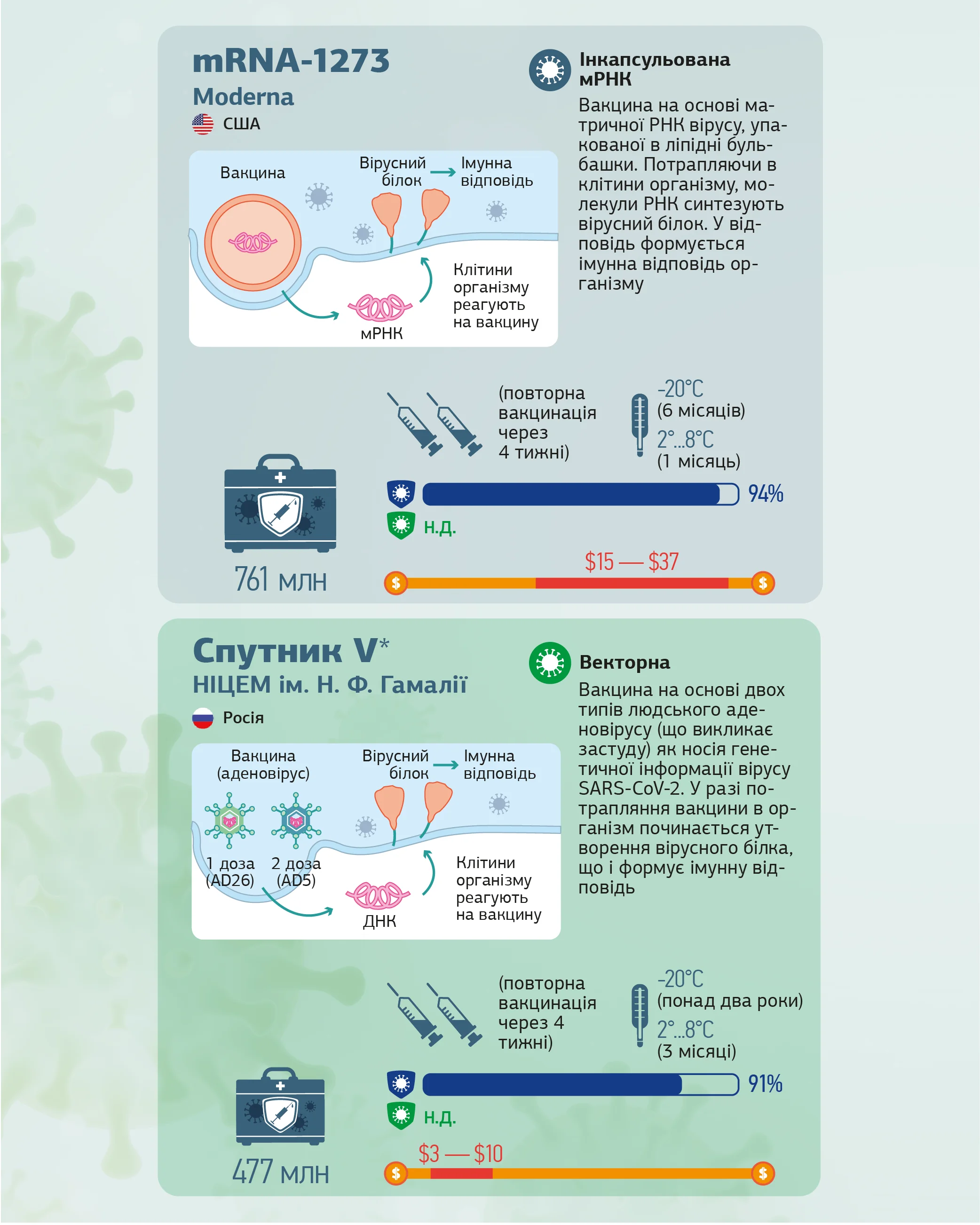 У графіку представлені офіційні назви вакцин і їхні розробники, розказано про принцип дії кожного препарату і його ефективності, а також описано особливості зберігання, вакцинації та вартість однієї дози.