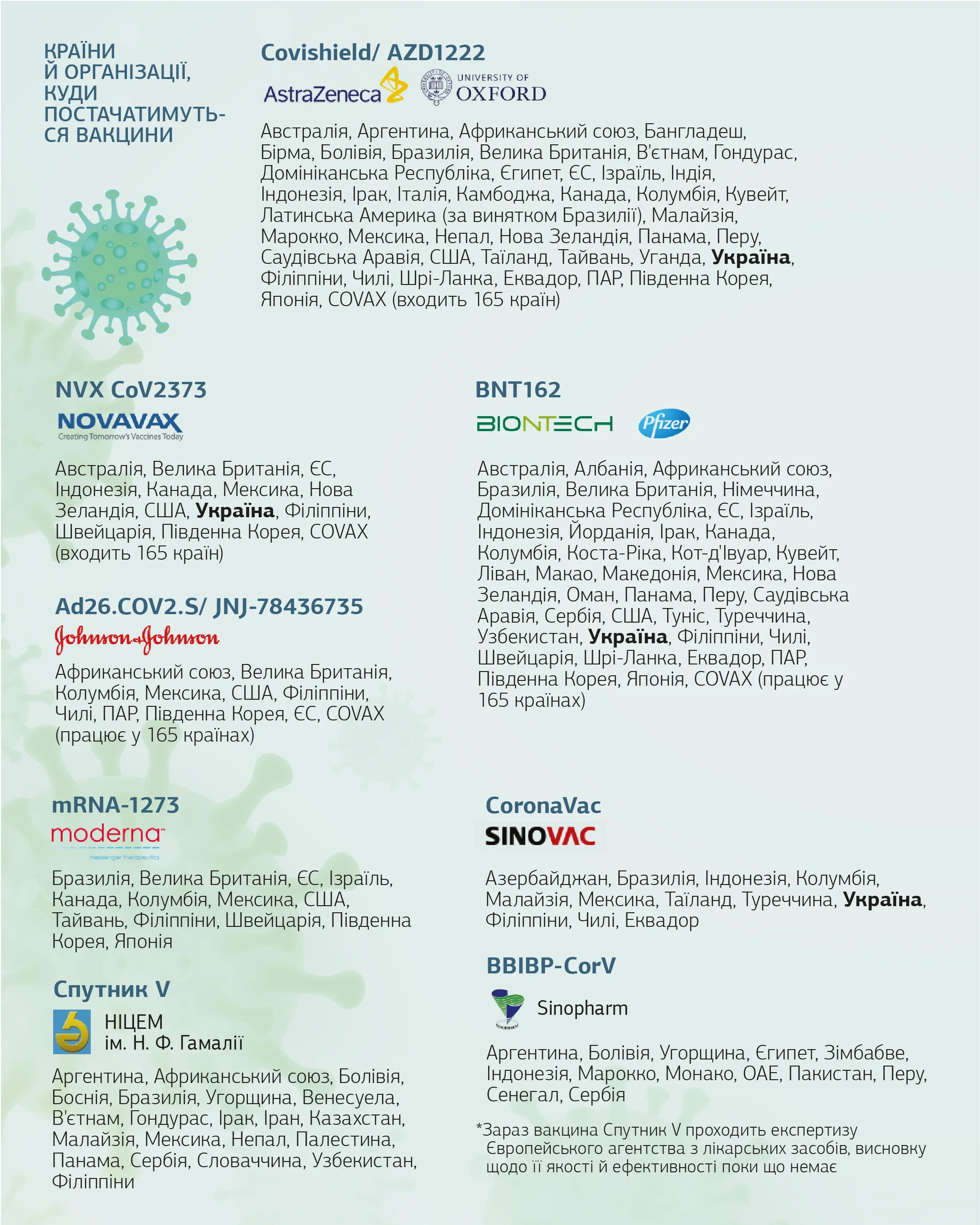 Журнал НВ у своїй інфографіці розповідає про основні вакцини проти COVID-19, які зараз використовуються у світі.
