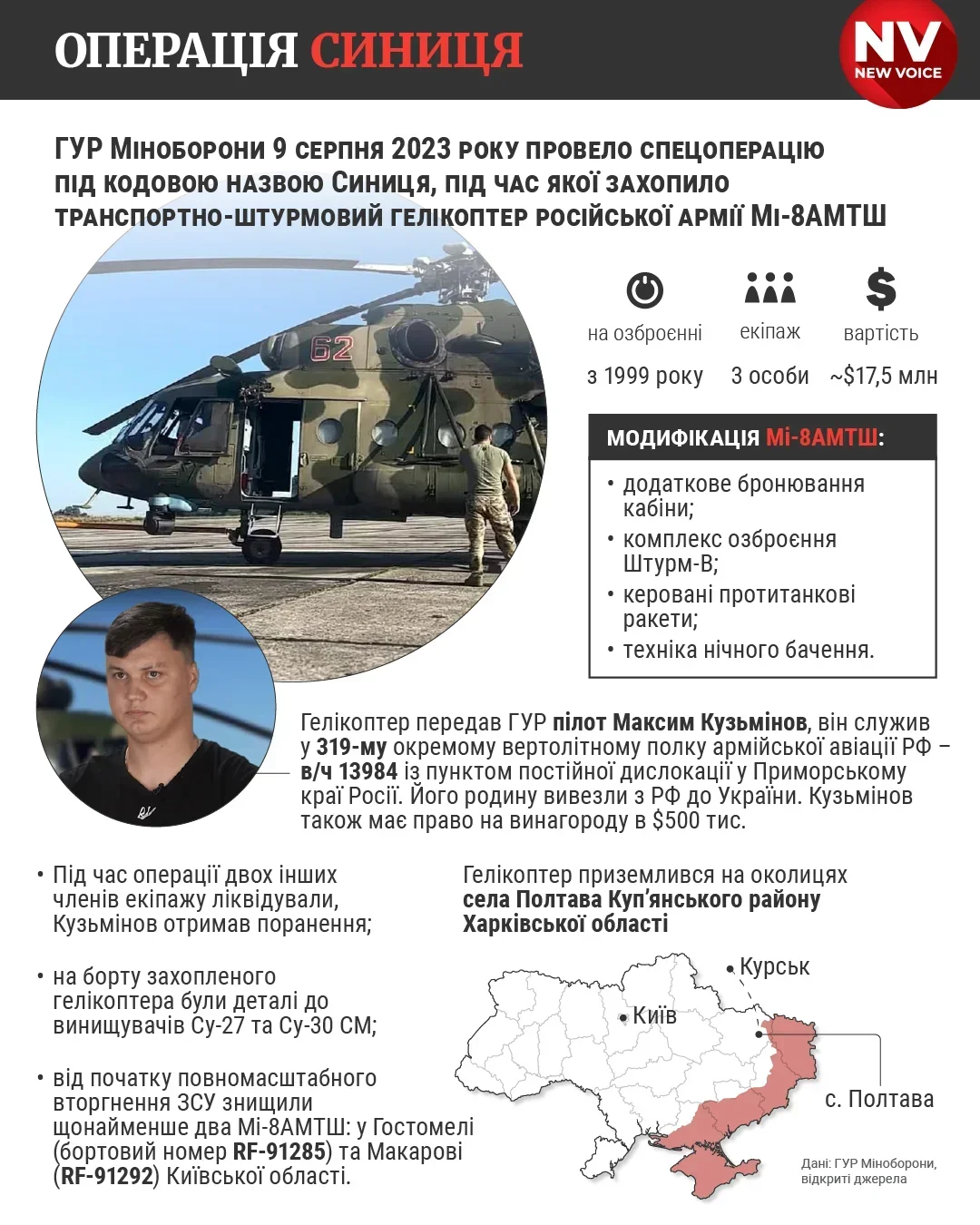 23 серпня 2023 року стало відомо, що російський вертоліт Мі-8 разом з екіпажем перелетів в Україну і здався Силам оборони. Це стало результатом тривалої спецоперації ГУР під кодовою назвою Синиця.