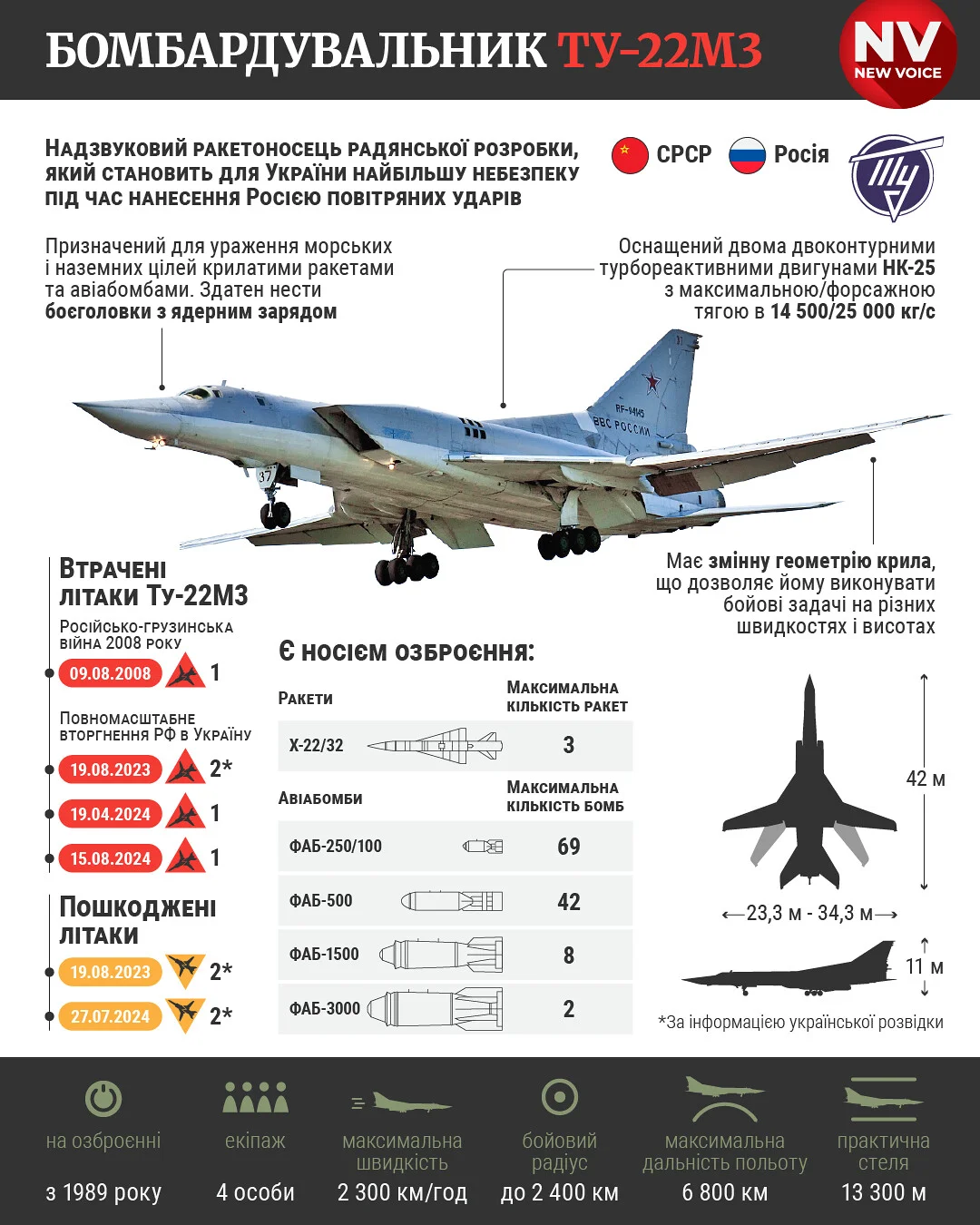 На думку колишнього офіцера Повітряних сил Храпчинського, найбільшу проблему зі всіх літаків стратегічної авіації наразі становить бомбардувальник Ту-22М3, оскільки це — носій складно перехоплюваних надзвукових протикорабельних ракет Х-22 і крилатих ракет класу повітря-поверхня Х-32. До того ж цей надзвуковий стратегічний бомбардувальник здатен підлітати до кордонів України, пускати ракети й на високій швидкості лишати зону пусків, що ускладнює його ураження засобами української ППО.
