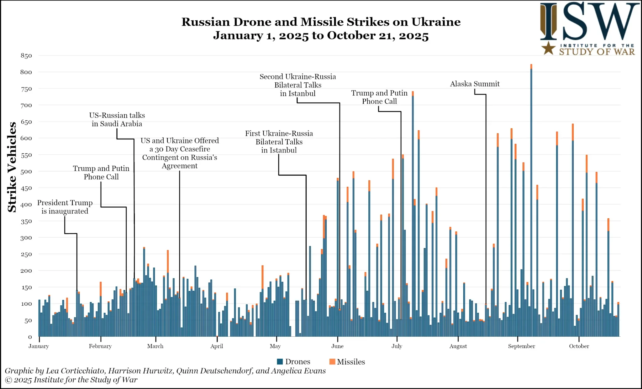 Фахівці також наголошують, що тривала та постійно посилювана кампанія далекобійних ударів Росії проти України — зокрема атаки по об'єктах української енергетичної інфраструктури — є лише одним із показників незацікавленості Кремля у мирі.