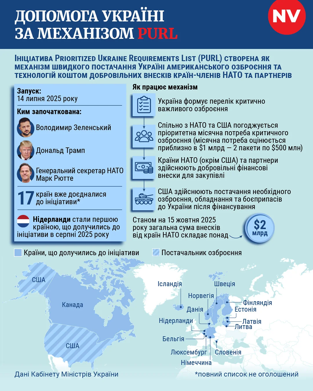 «Перші чотири пакети — загальною вартістю близько 2 мільярдів доларів — були профінансовані: Нідерландами (4 серпня); Данією, Норвегією та Швецією (5 серпня); Німеччиною (13 серпня); і Канадою (24 серпня). Окрім уже профінансованих пакетів PURL, низка союзників працює над додатковими зобов’язаннями», — сказало джерело видання.