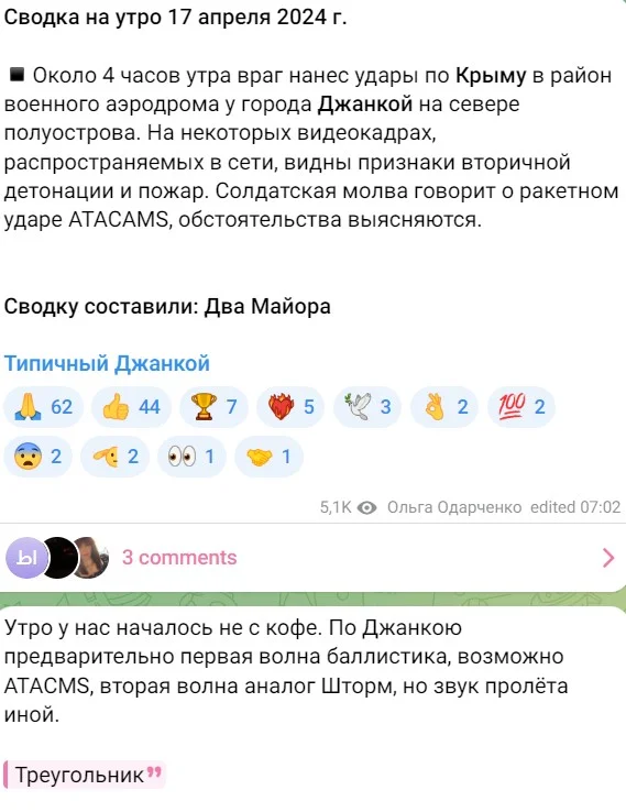 07:41 У російських пабліках дискутують про те, чим могли завдати ударів по Джанкою, серед версій — ATACMS