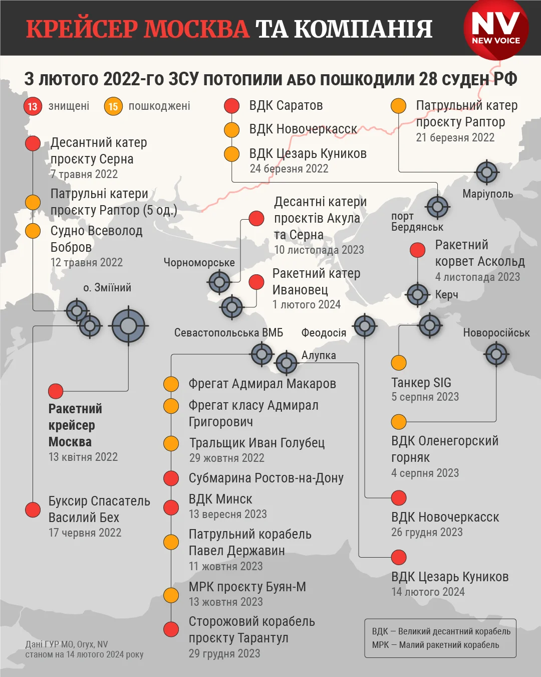 NV напоминает о наиболее точных из ударов ВСУ, благодаря которым было уничтожено или повреждено почти три десятка военных кораблей оккупантов, что подтверждено OSINT-аналитиками, фото- и видеодоказательствами.