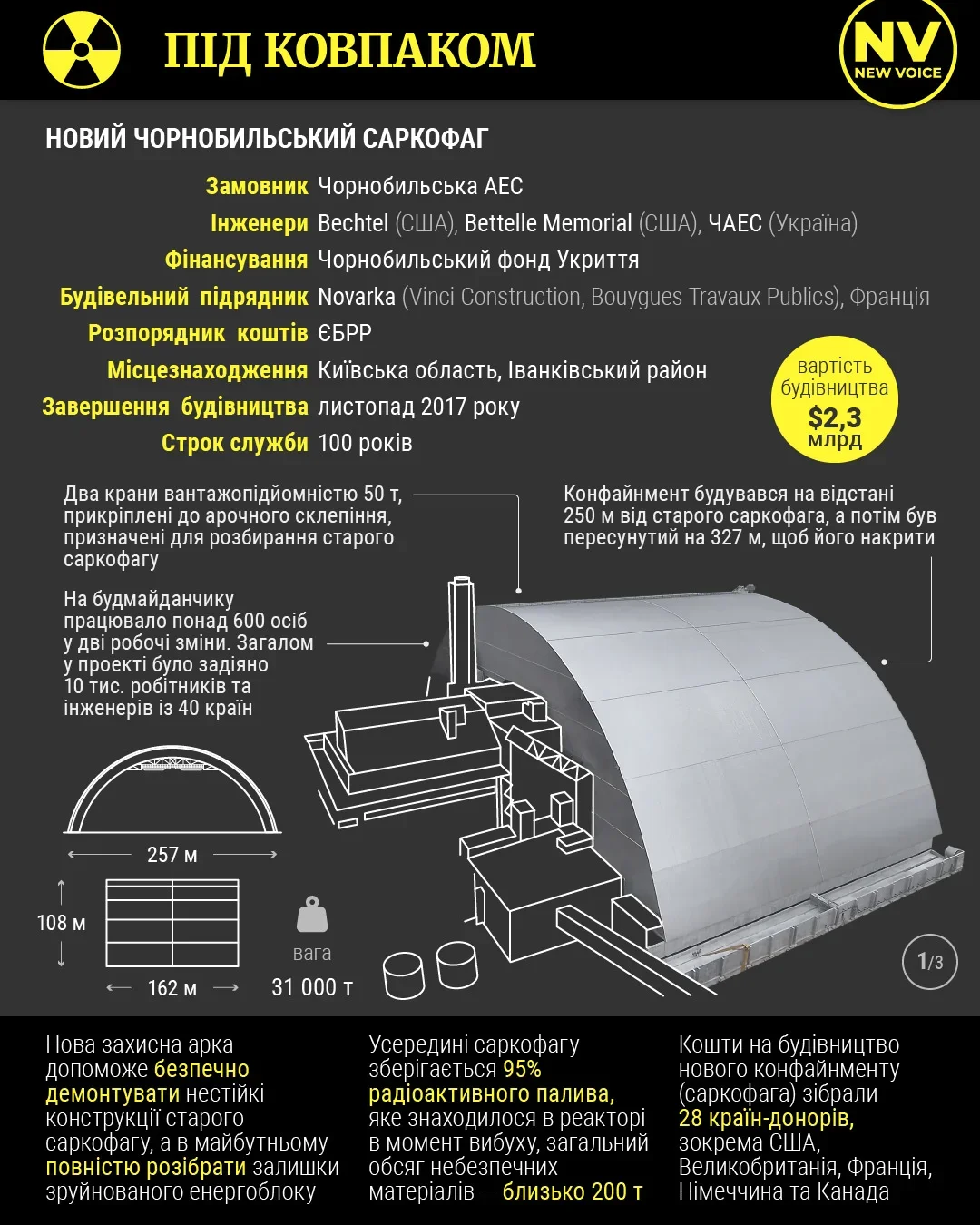 Защитное сооружение — новый безопасный конфайнмент — построили в 2017 году за 1,5 миллиарда евро. Оно состоит из двух арочных конструкций и накрывает старый советский саркофаг над реактором № 4, на котором в 1986 году произошла одна из крупнейших техногенных катастроф в мире.