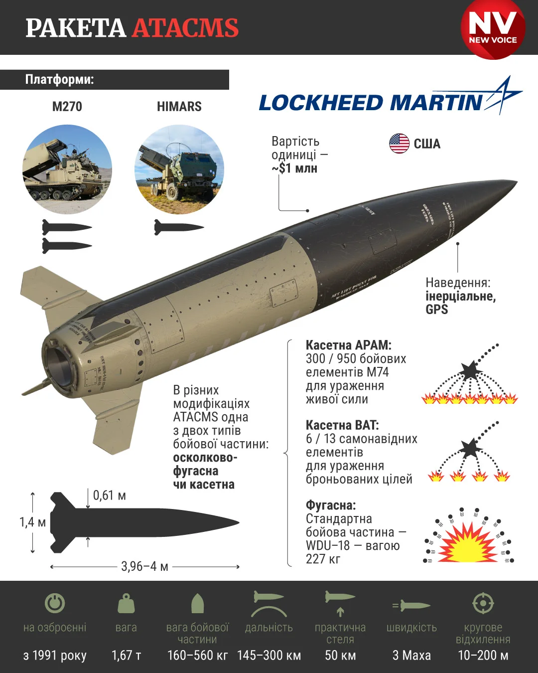 Долгожданные ракеты ATACMS, которые можно использовать с РСЗО HIMARS или M270, Украина впервые получила осенью 2023 года. Тогда ВСУ передали кассетный вариант этих ракет MGM-140A — они имеют меньшую дальность полета (165 км, а не 300 км), но большее количество поражающих суббоеприпасов (950 штук в одной ракете). Каждый из таких мини-боеприпасов имеет форму сферы диаметром 75 мм и массой около 500 граммов. Один суббоеприпас может образовывать во время детонации около 260 обломков, создающих зону поражения до 15 квадратных метров. Эффективность этих ракет ВСУ впервые проверили осенью 2023 года, ударив по аэропортам Луганска и Бердянска и уничтожив девять российских вертолетов в один день.